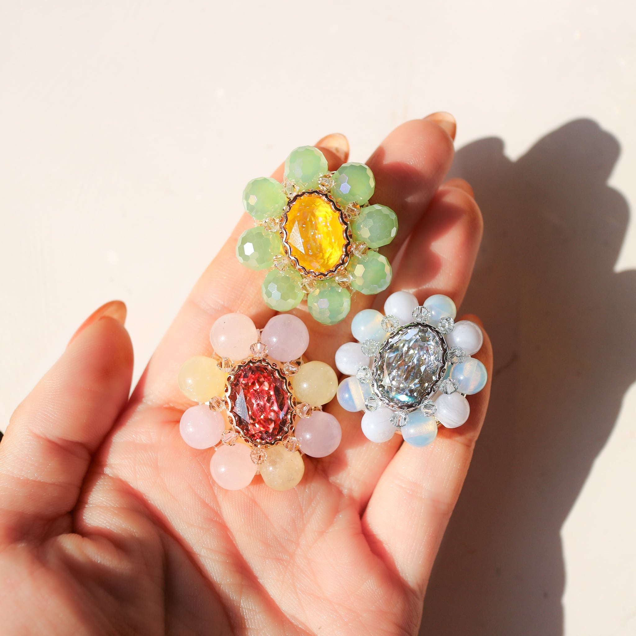 中央にガラスビジューを縫い付け、淡くオーロラ加工が施された多面カットのガラスビーズを、周りに手作業で縫い付けています。