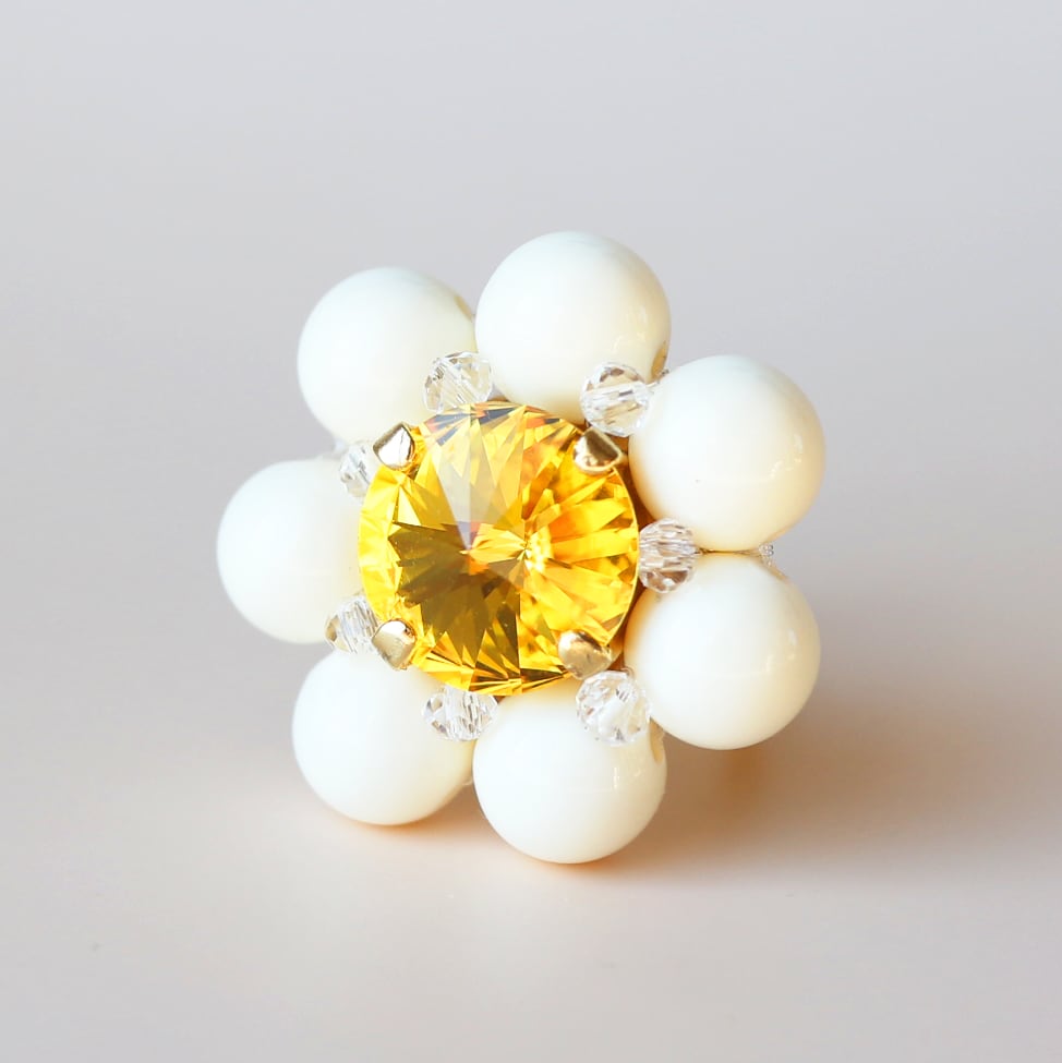 クリスタルガラスを中央に、周りにはドイツ製のアクリルビーズとガラスビーズを一つ一つ手作業で縫い付けております。