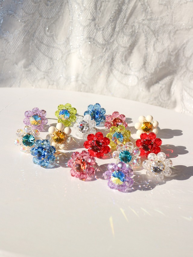 クリスタルガラスを中央に周りにはガラスビーズを一つ一つ手作業で縫い付けております。