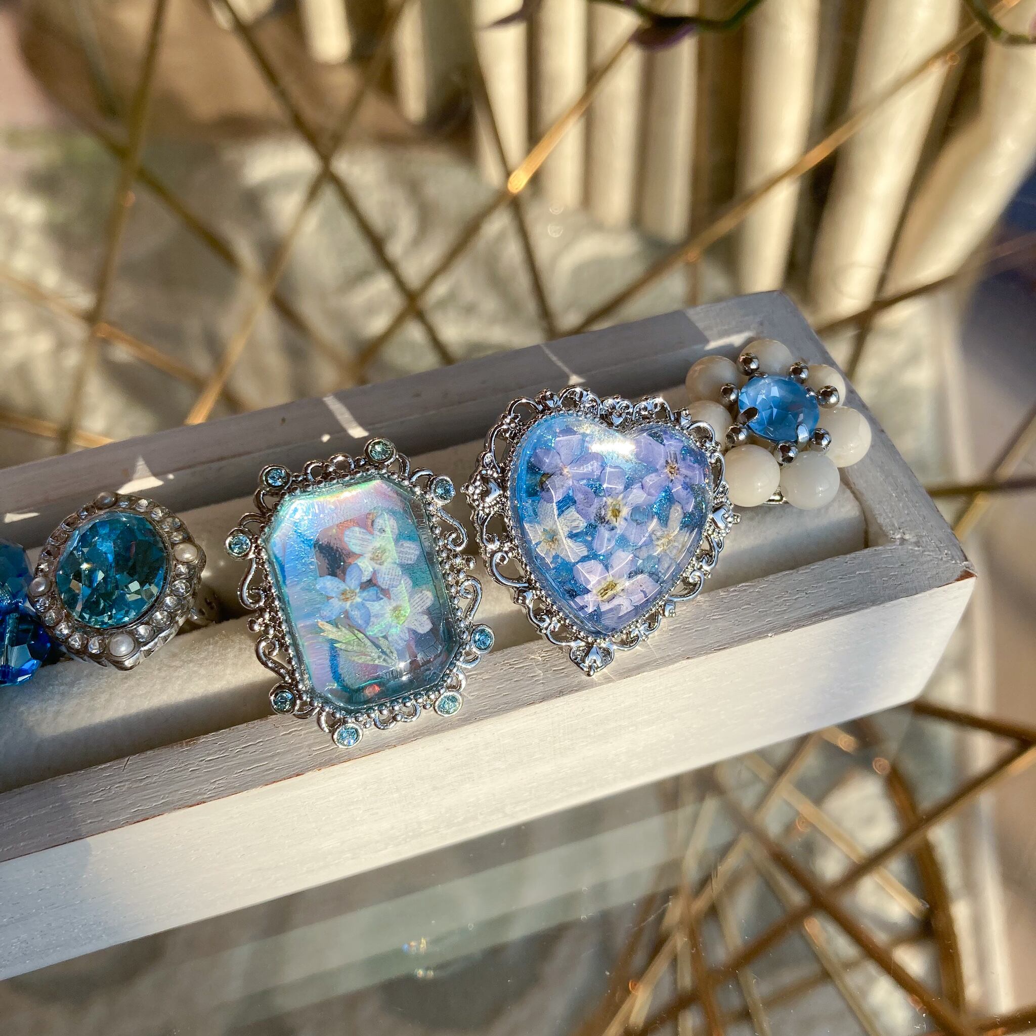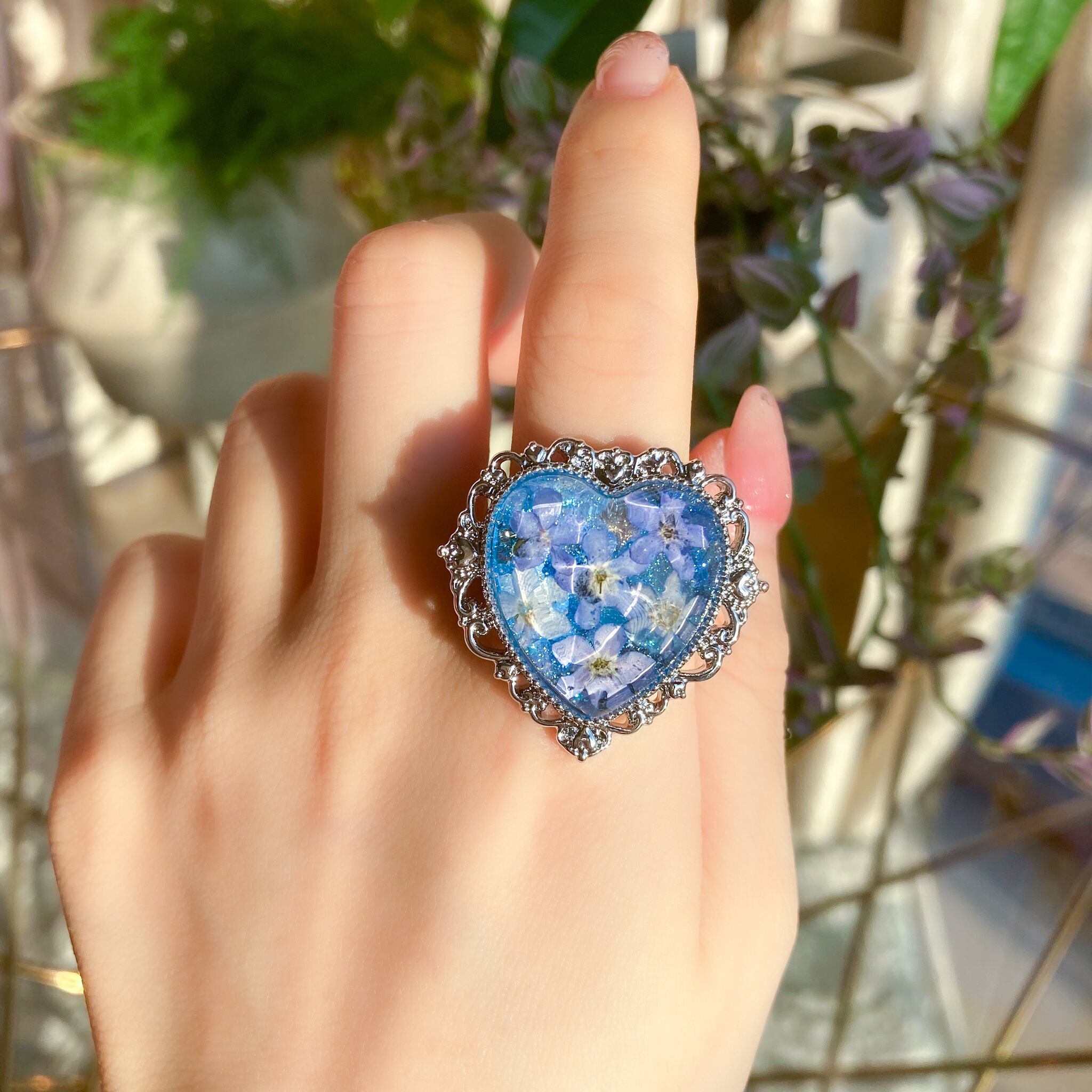 勿忘草をゼリーに閉じ込めたかのようなリングです。