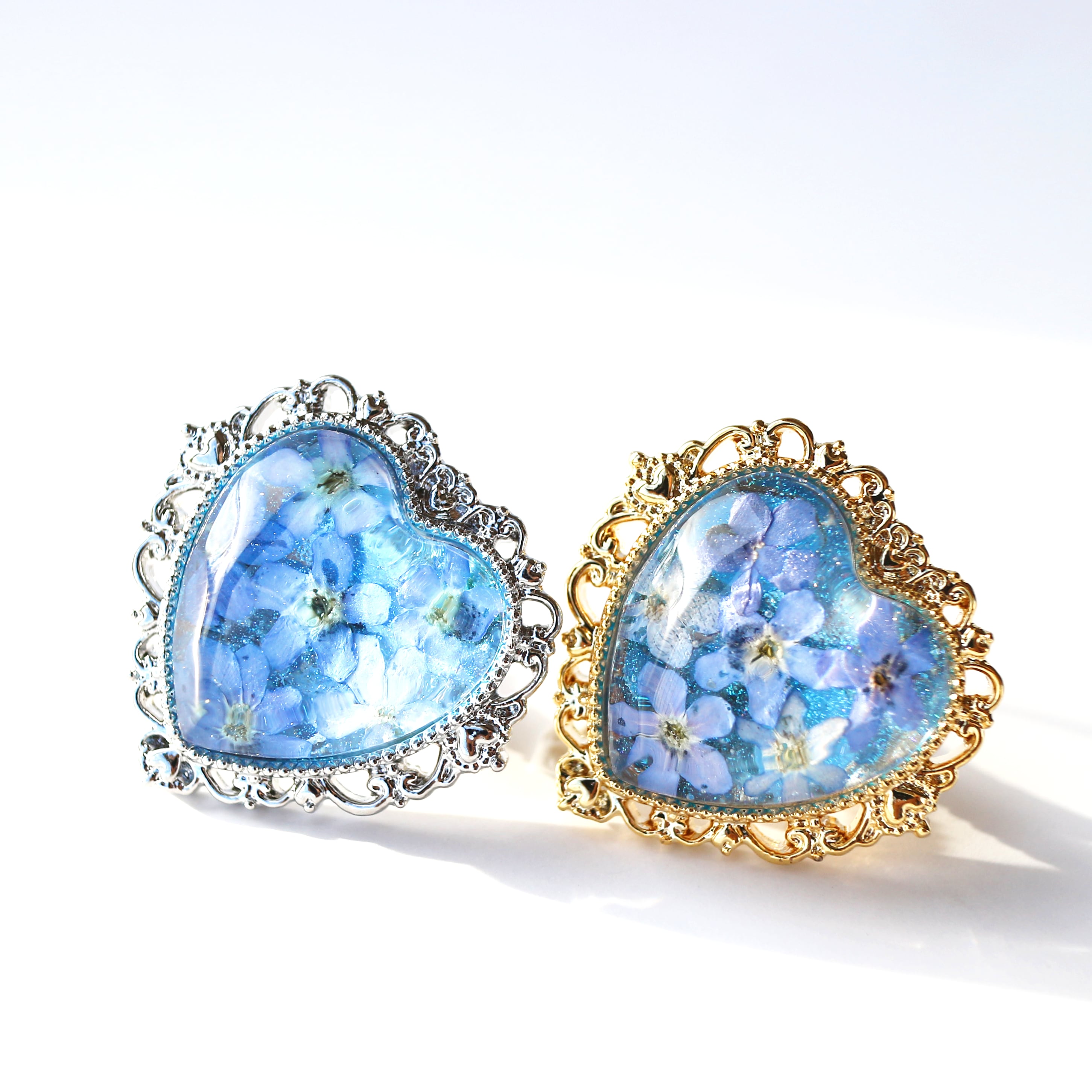 その点を考慮し、押し花を閉じ込める前に淡いブルーのレジンを重ねております。