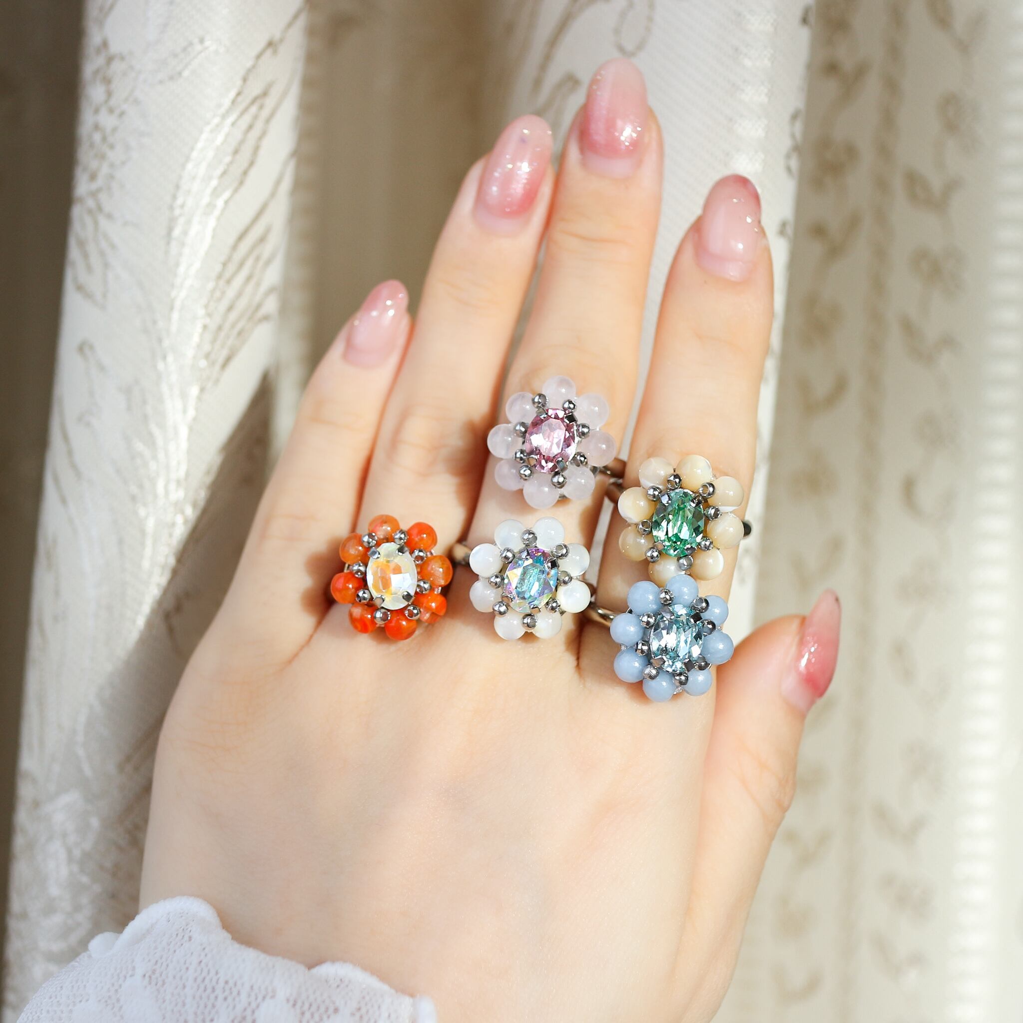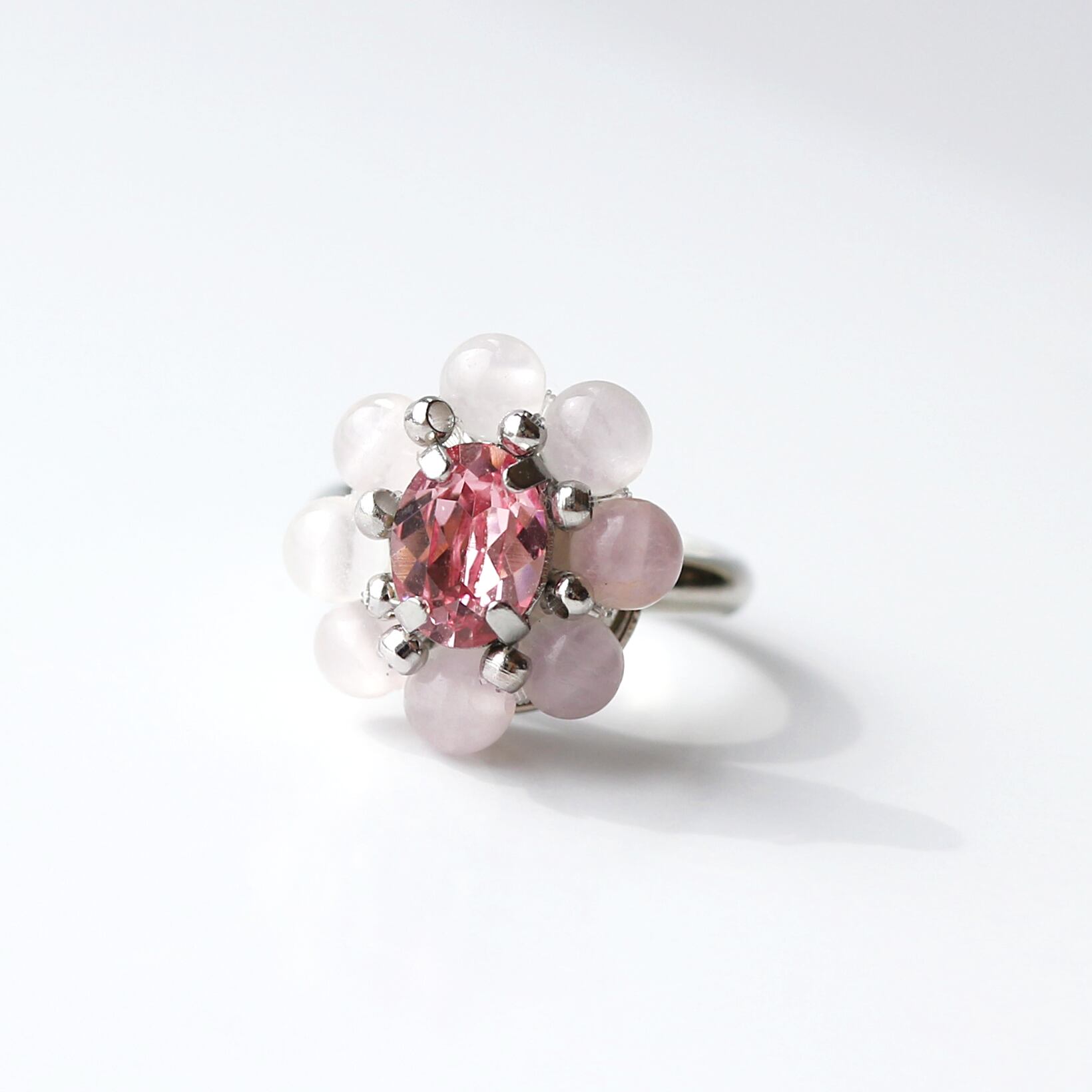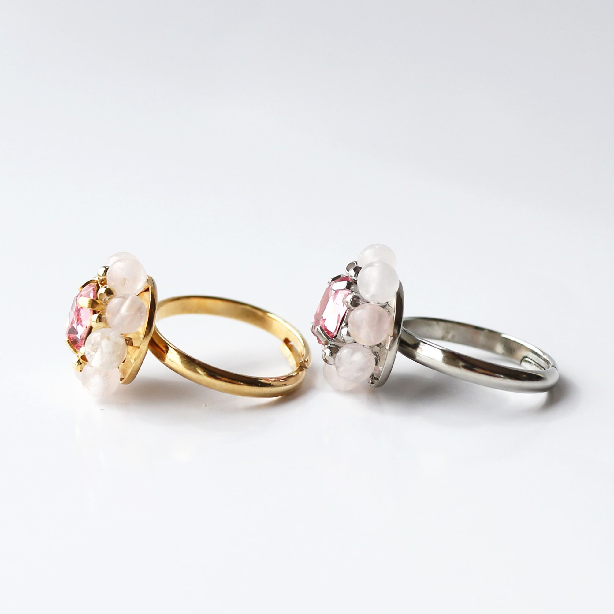 中央にクリスタルガラスビジューを縫い付け、ローズクォーツとメタルビーズを一つ一つ手作業で縫い付けております。