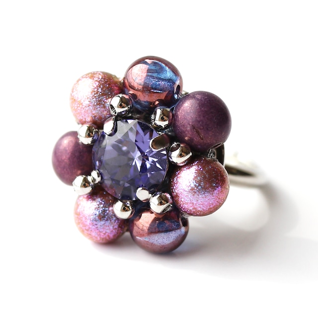 周りに色味の違うパープルのガラスビーズと表面にラメ加工が施されたピンクパープルのビーズを一つ一つ手作業で縫い付けております。