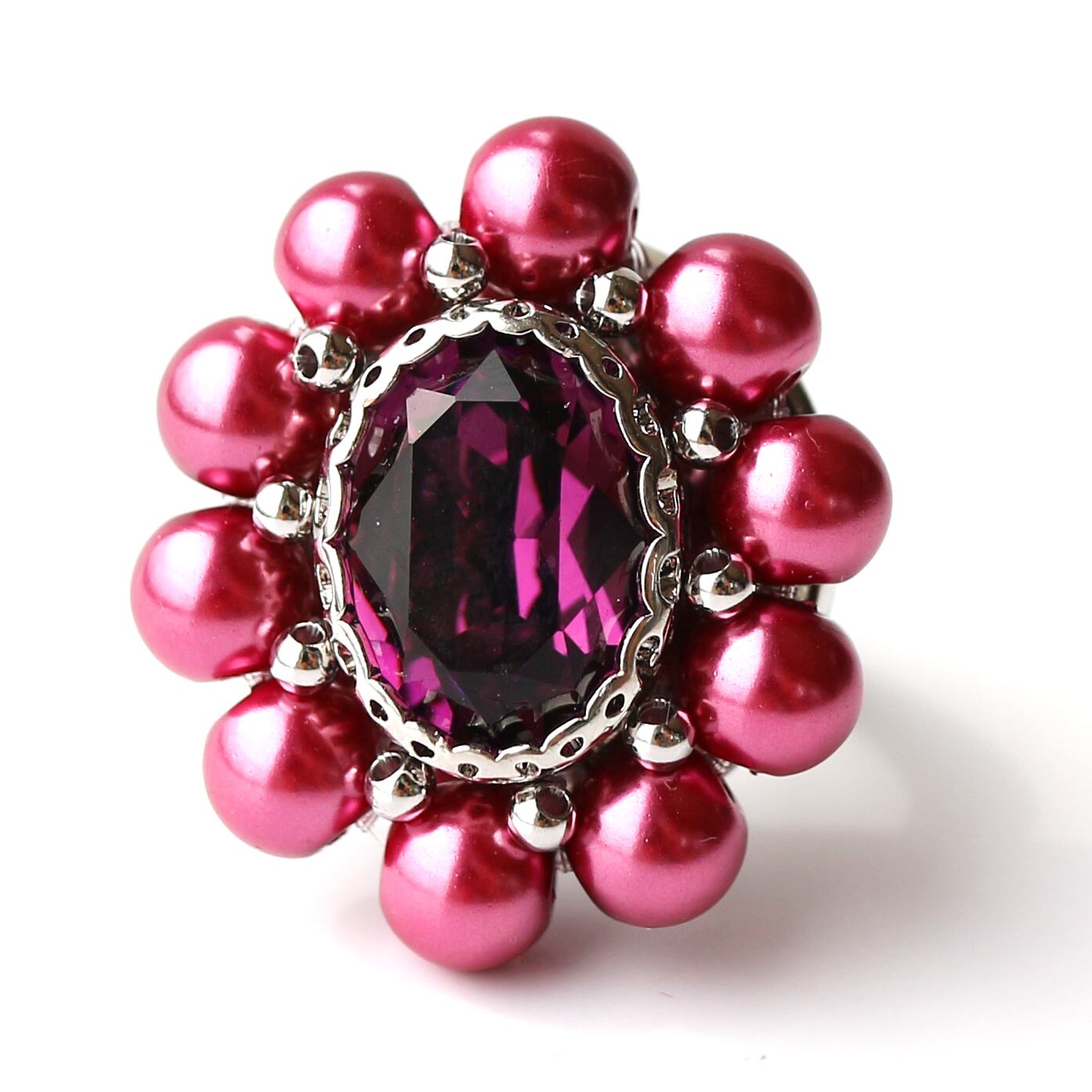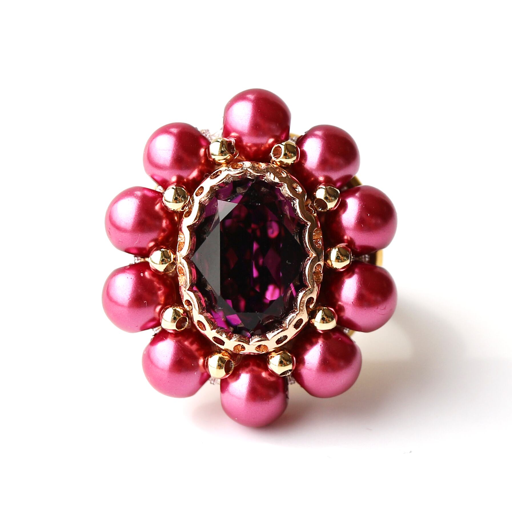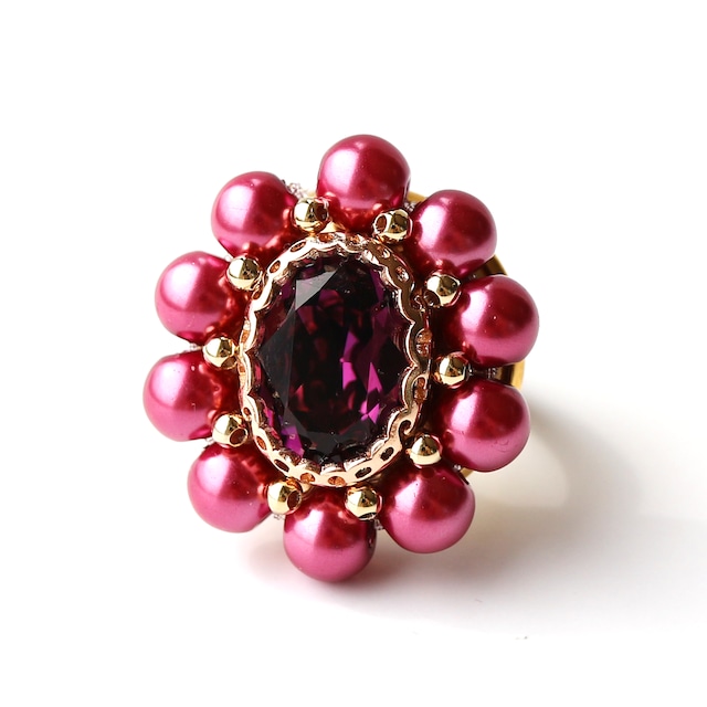 中央にアメジストカラーのガラスビジューを縫い付け、周りにシックなフランボワーズ色が大人びた装いの光沢が美しいガラスパールビーズを一つ一つ手作業で縫い付けております。