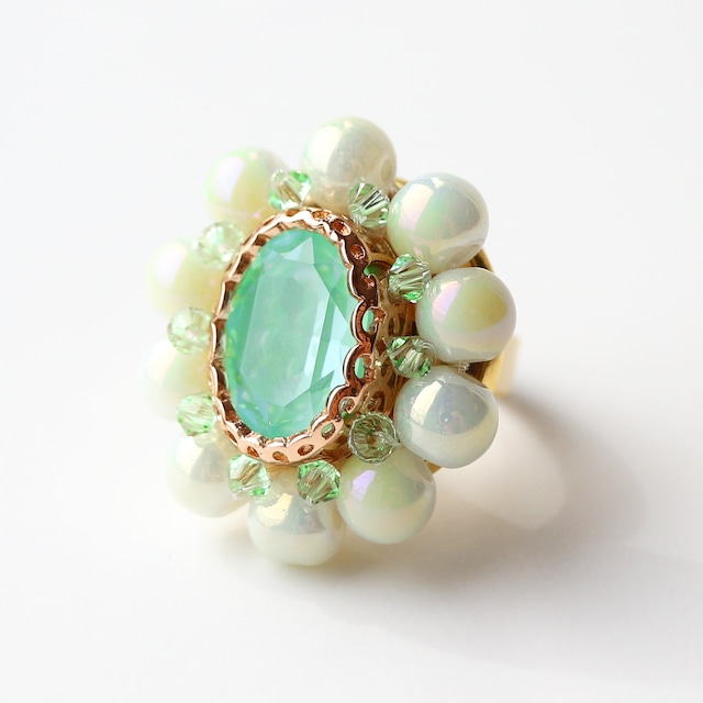 中央にミントカラーのガラスビジューを縫い付け、周りにはほんのりオーロラ調の加工が施された淡いグリーン色のガラスビーズを一つ一つ手作業で縫い付けております。