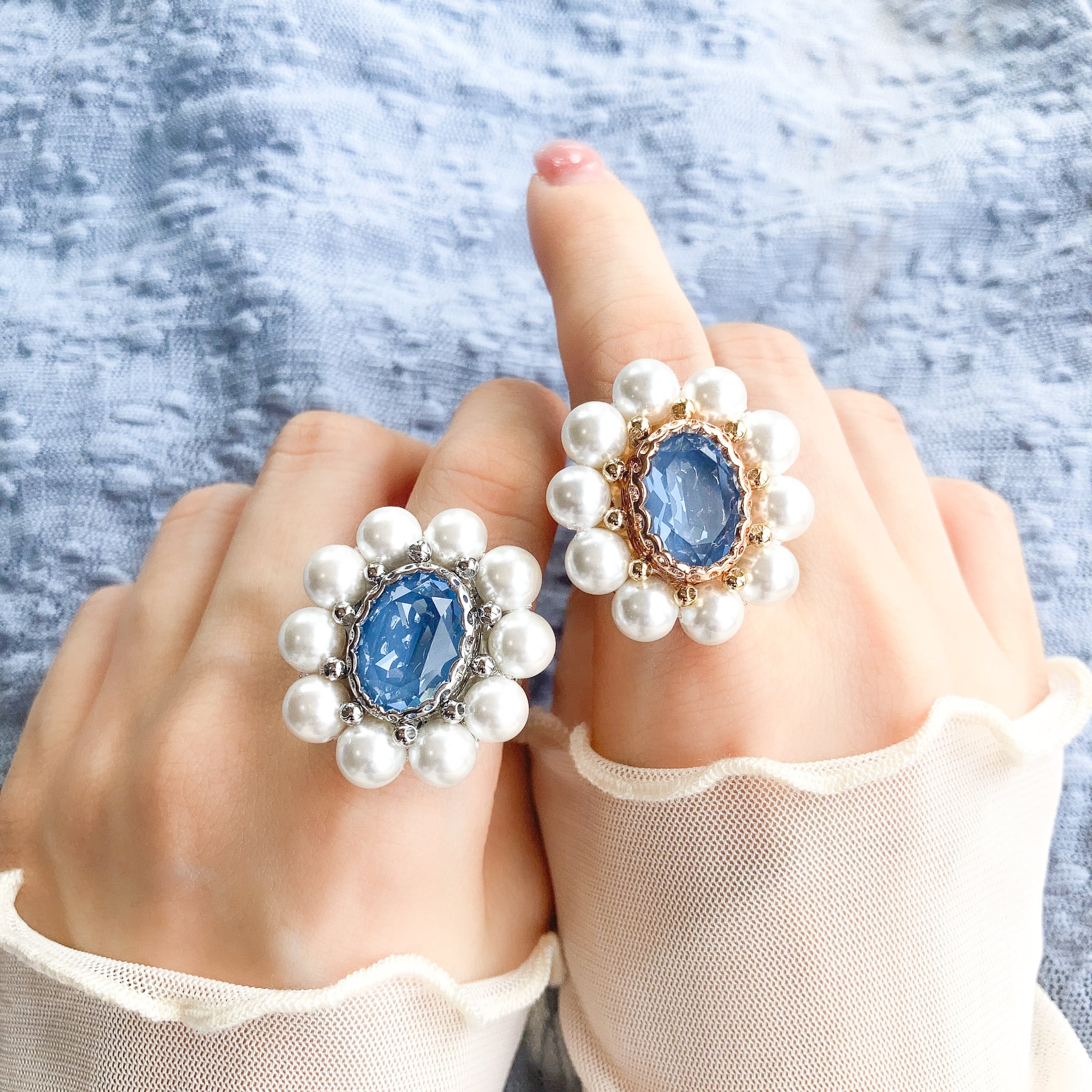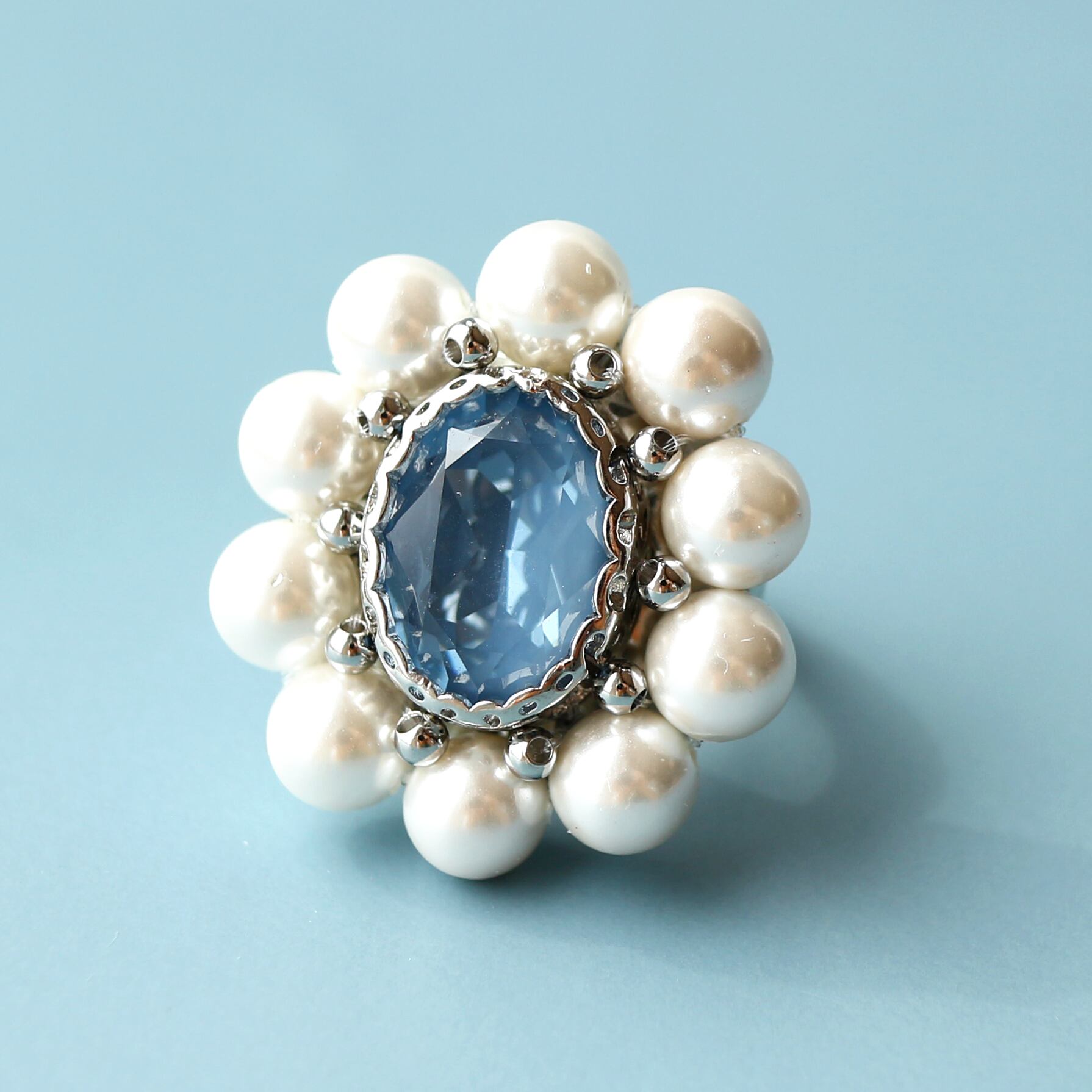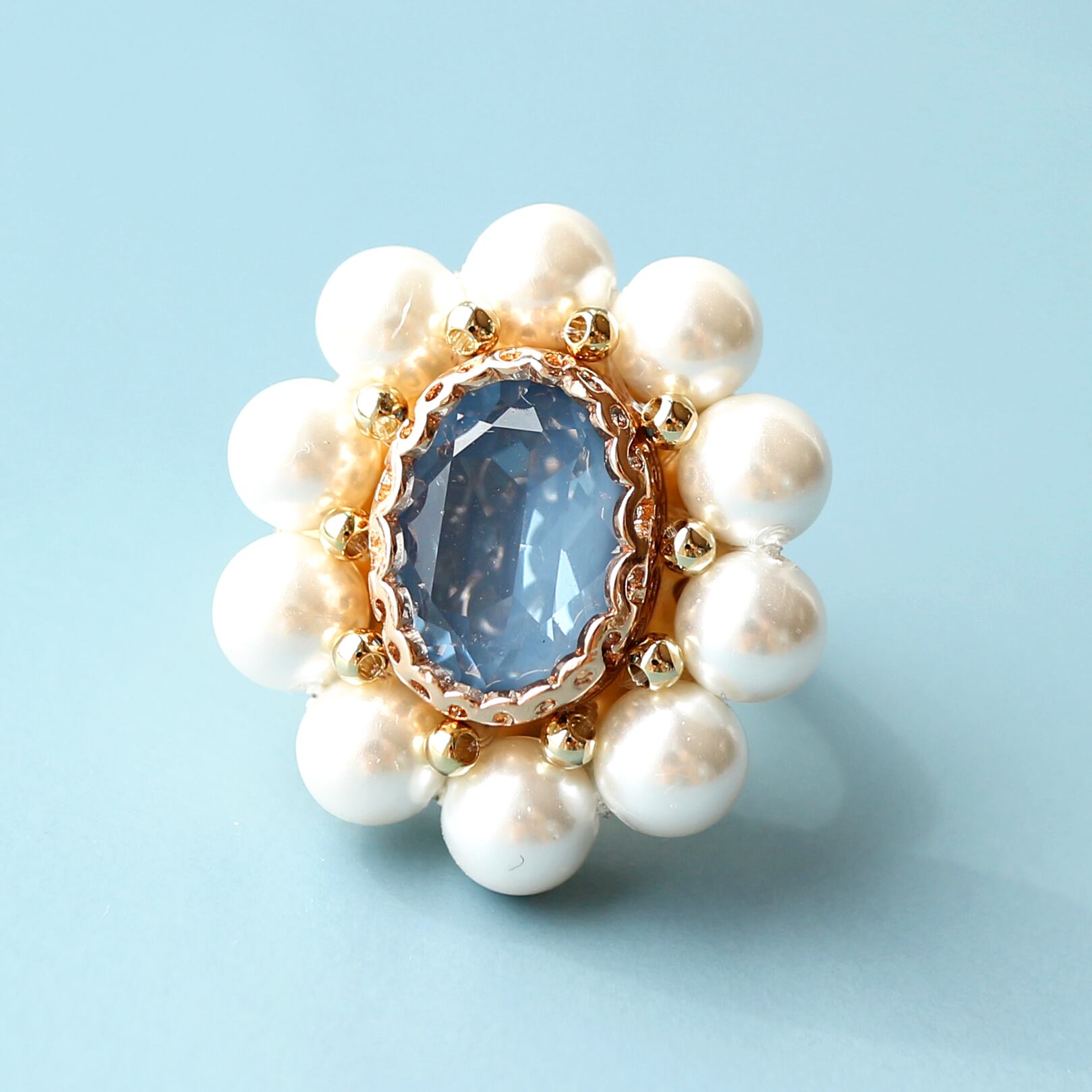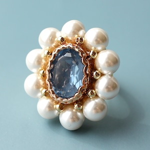 中央にデニムブルーカラーのガラスビジュー、周りに貝パールを一つ一つ手作業で縫い付けております。