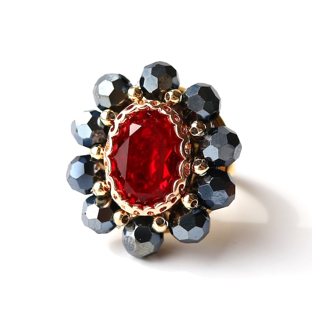 中央にレッドカラーのガラスビジューを縫い付け、周りにカットが施されたブラックのガラスビーズを縫い付けています。カットが入っているので角度を変えるとキラキラと輝きます。