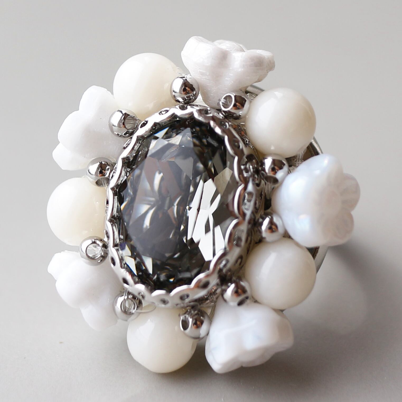 中央にブラックカラーのガラスビジューを縫い付け、周りにはホワイトコーラル(白珊瑚)とお花型のガラスビーズを交互に縫い合わせています。