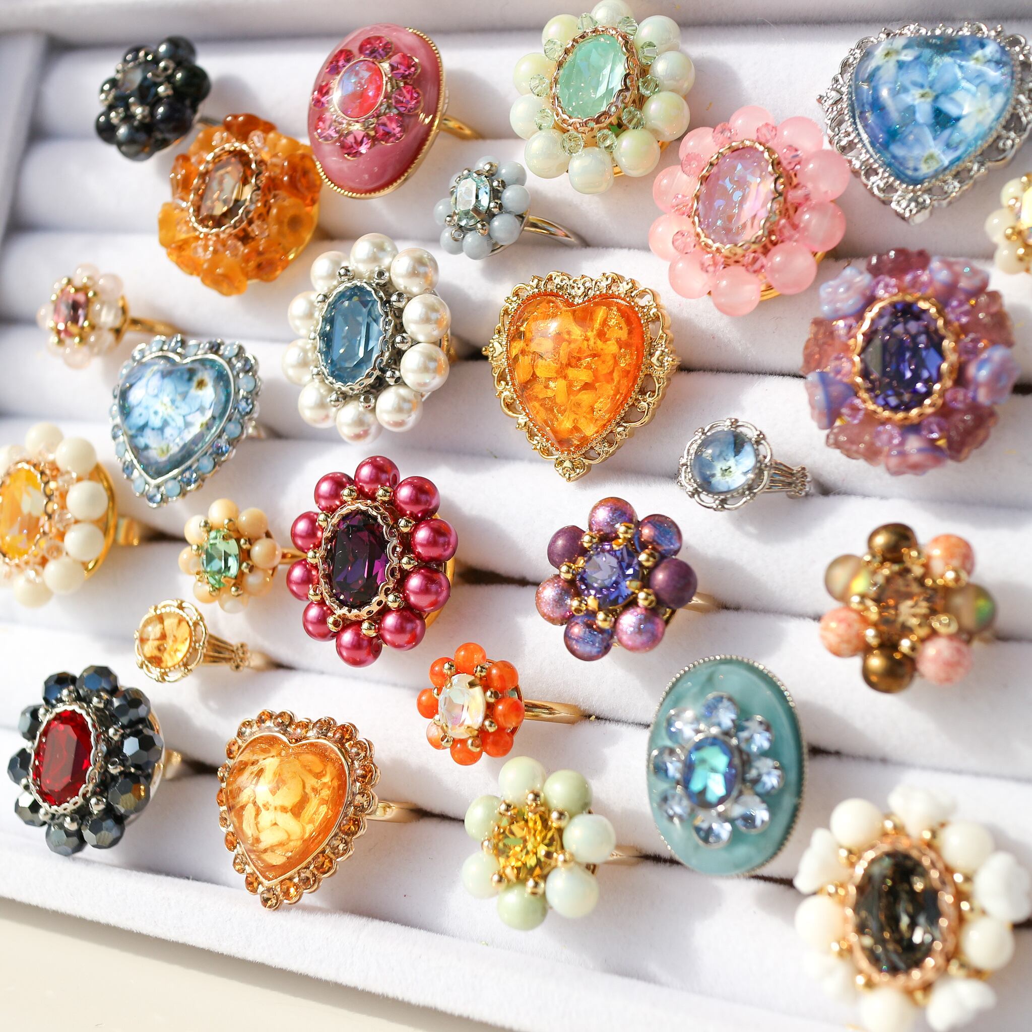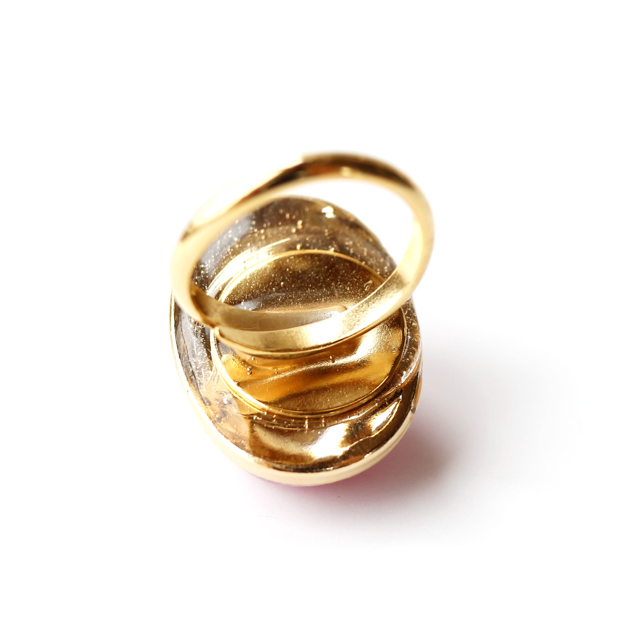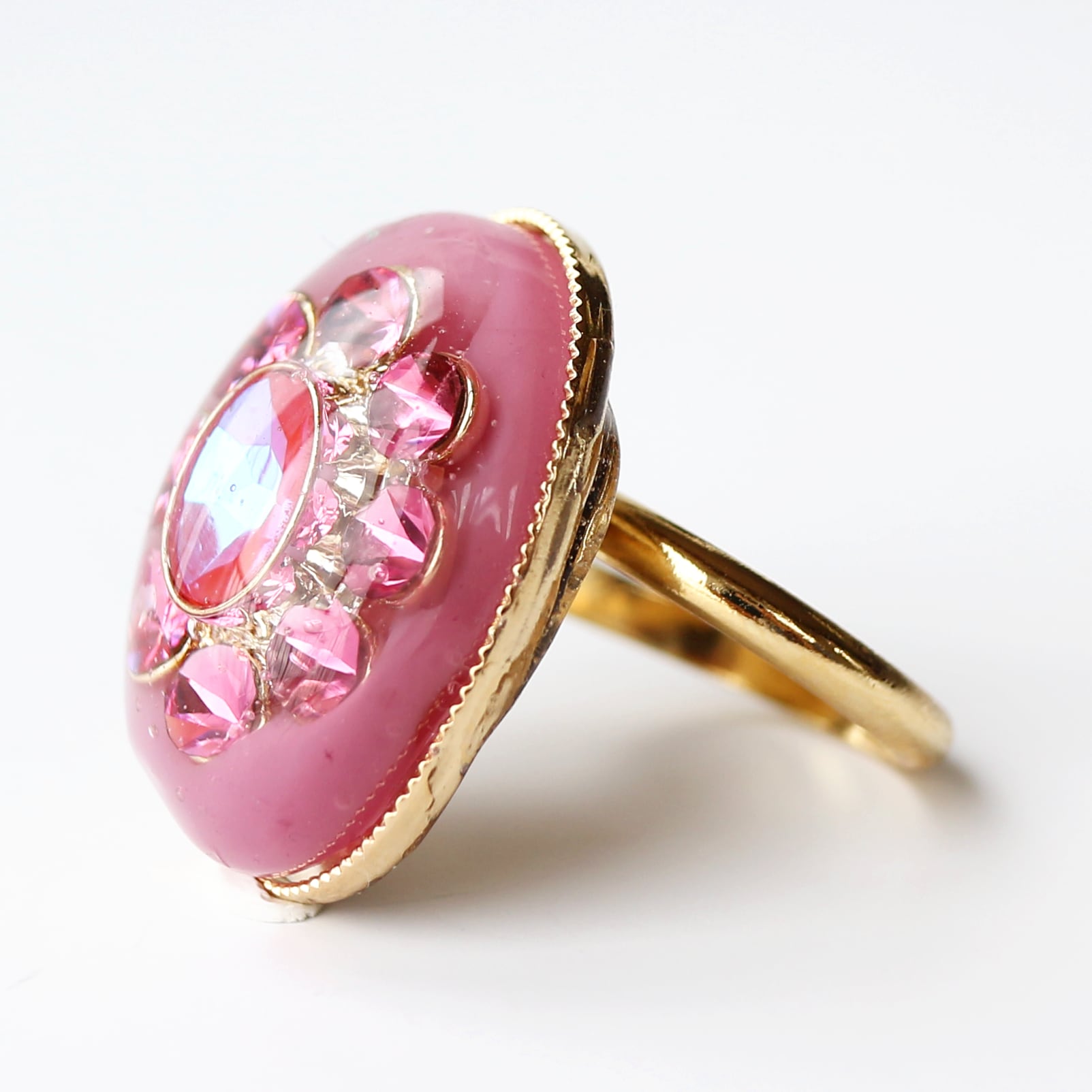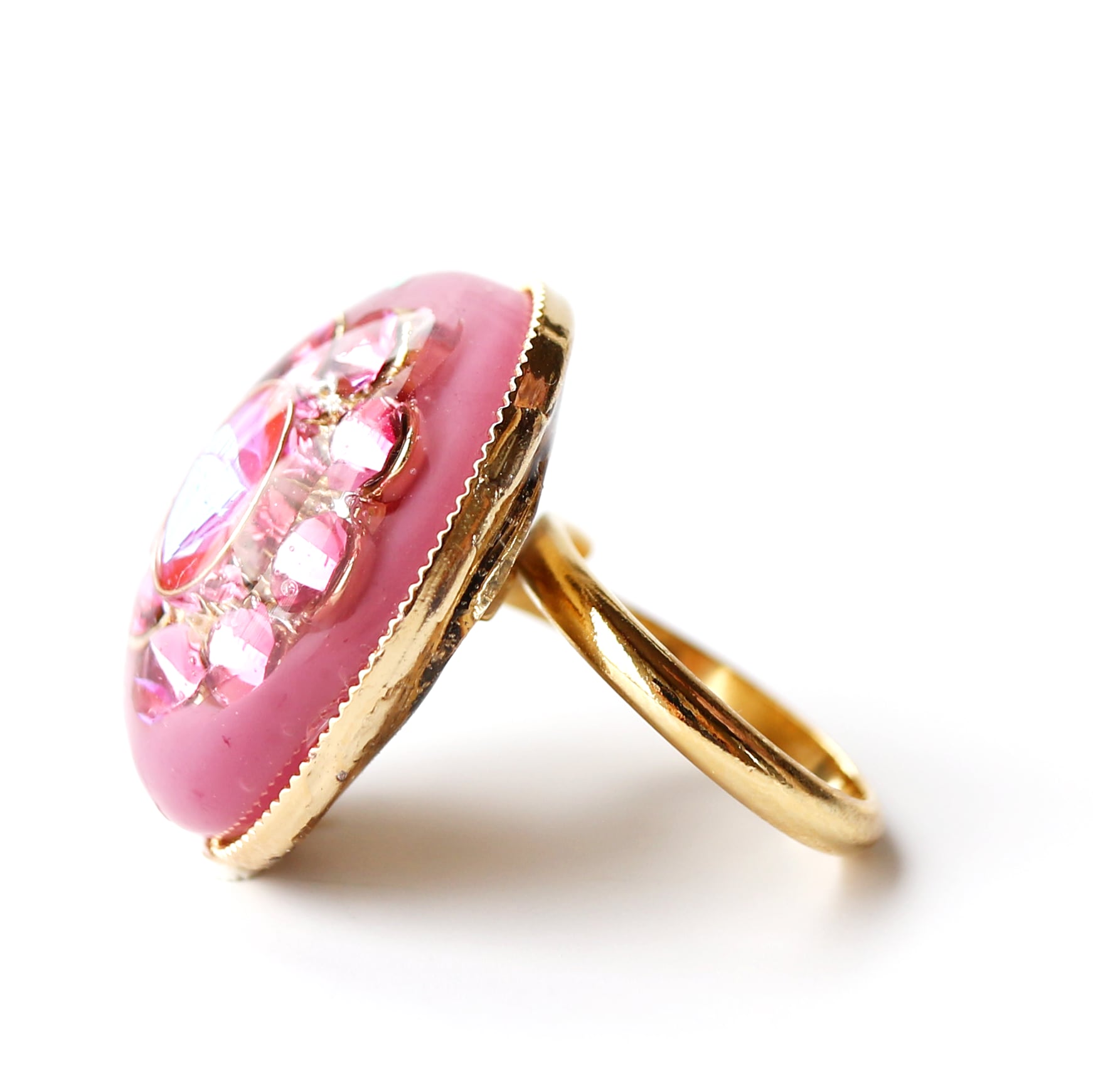 くすみピンクを背景に、クリスタルガラスのパーツがきらめくリング。