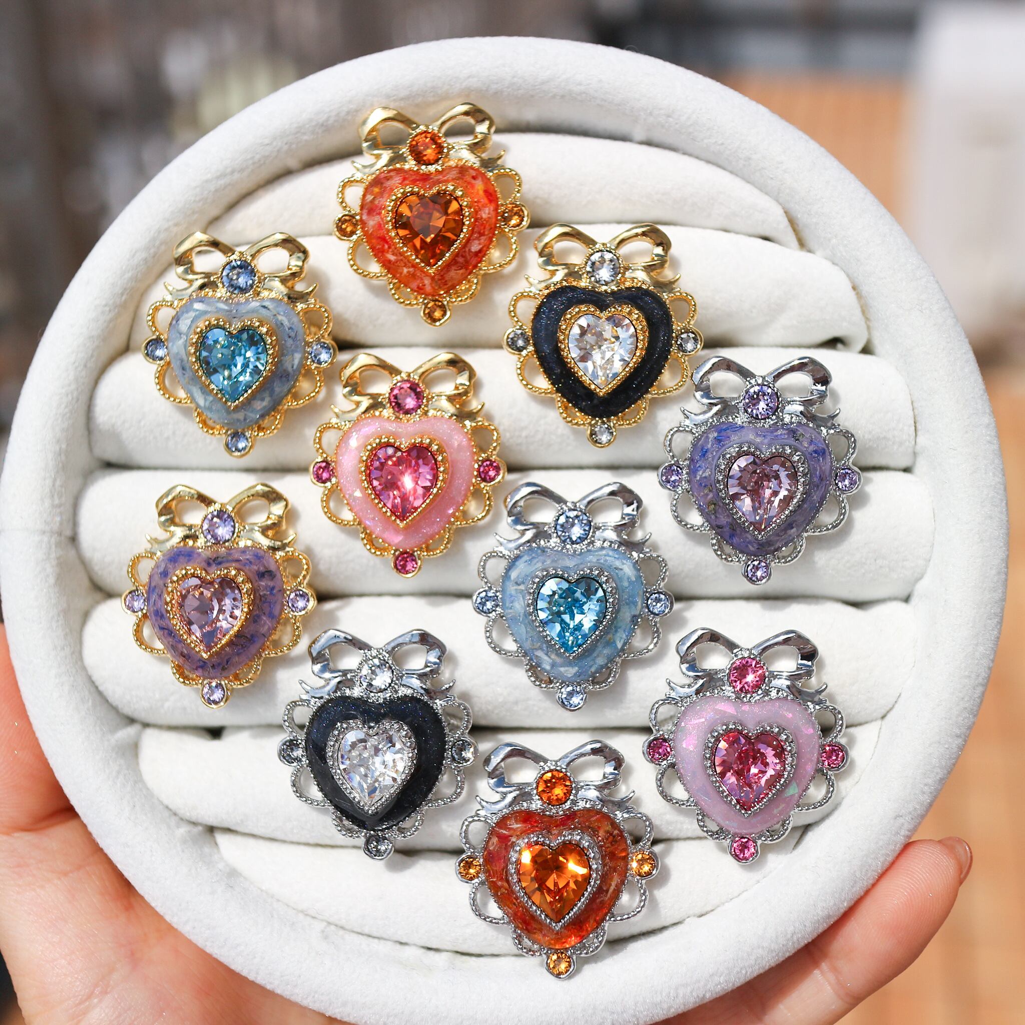 中央のガラスビジューの周りには、ガラスの色に合わせて調合したレジンを流し込んでいます。