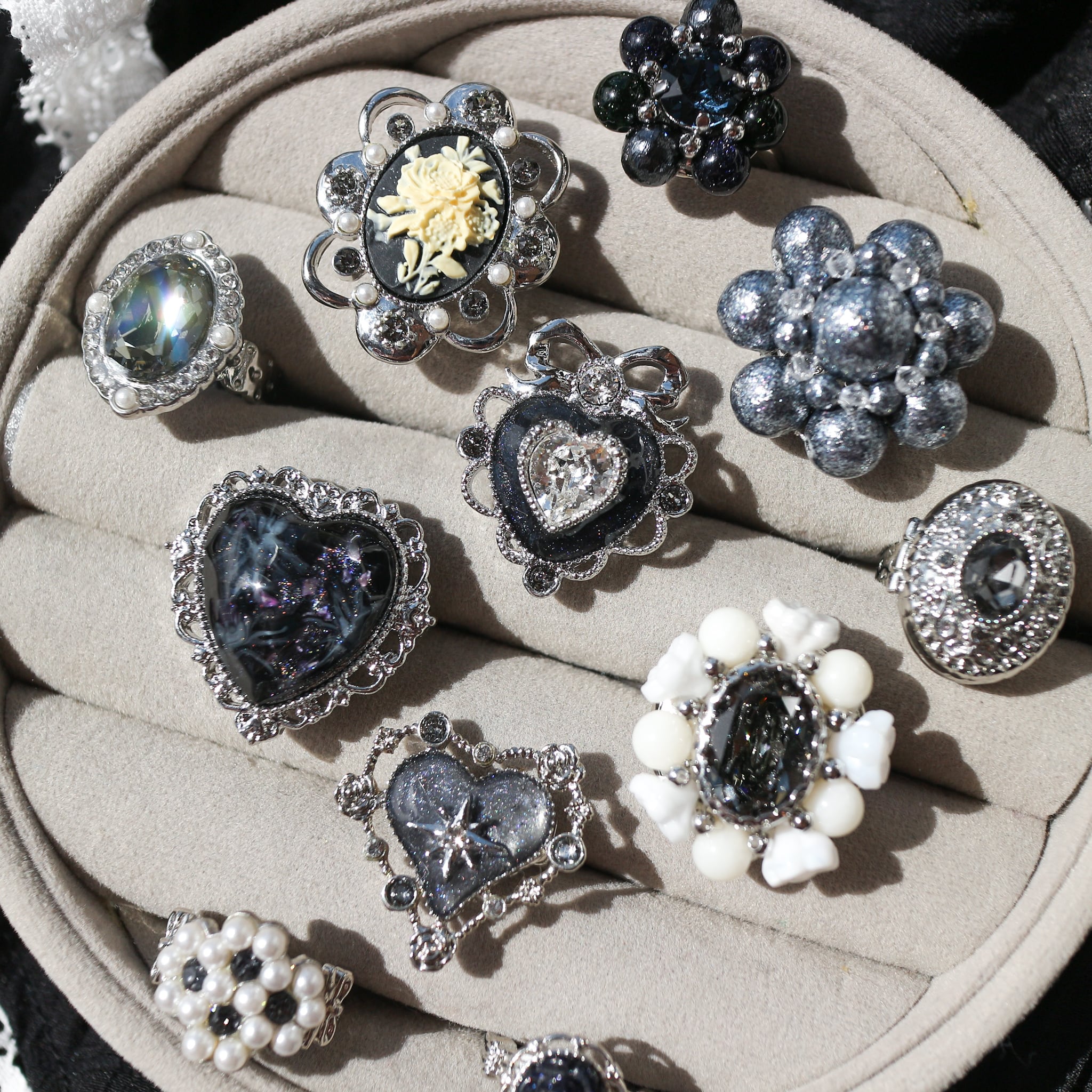 クリアカラーのガラスビジューと、ラメ入りのブラックカラーのレジンを流し、