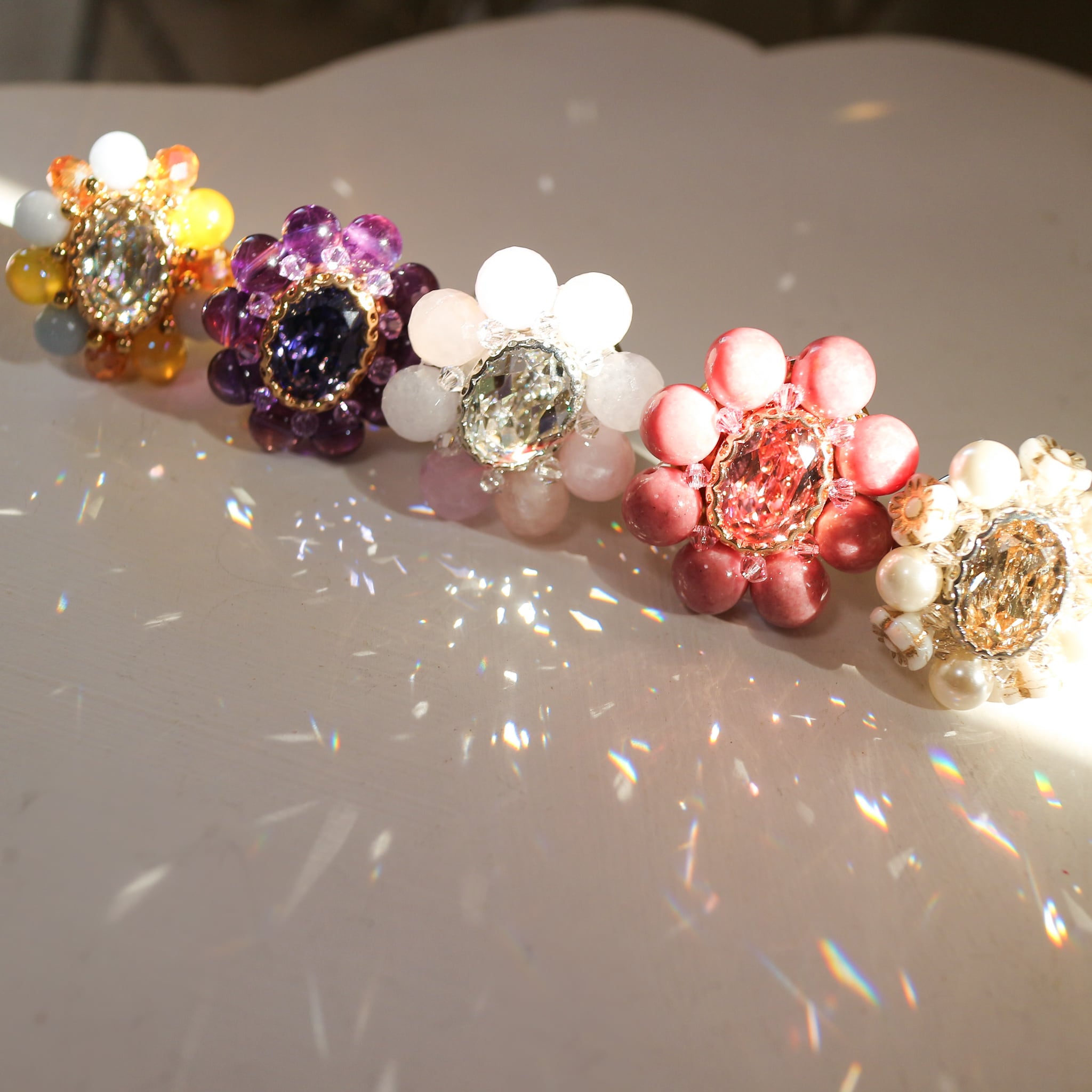中央にシルクカラーのクリスタルガラスビジューを縫い付け、