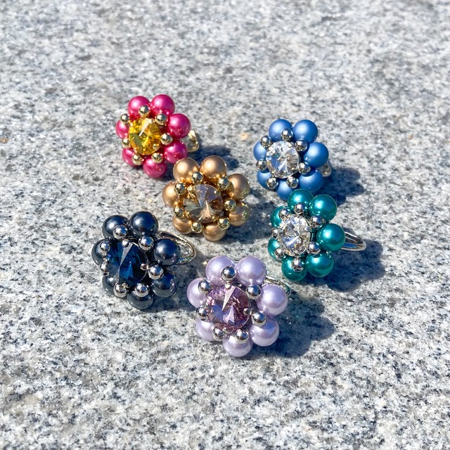 クリスタルガラスを中心に、周りには樹脂パールとメタルビーズを一つ一つ手作業で縫い付けております。