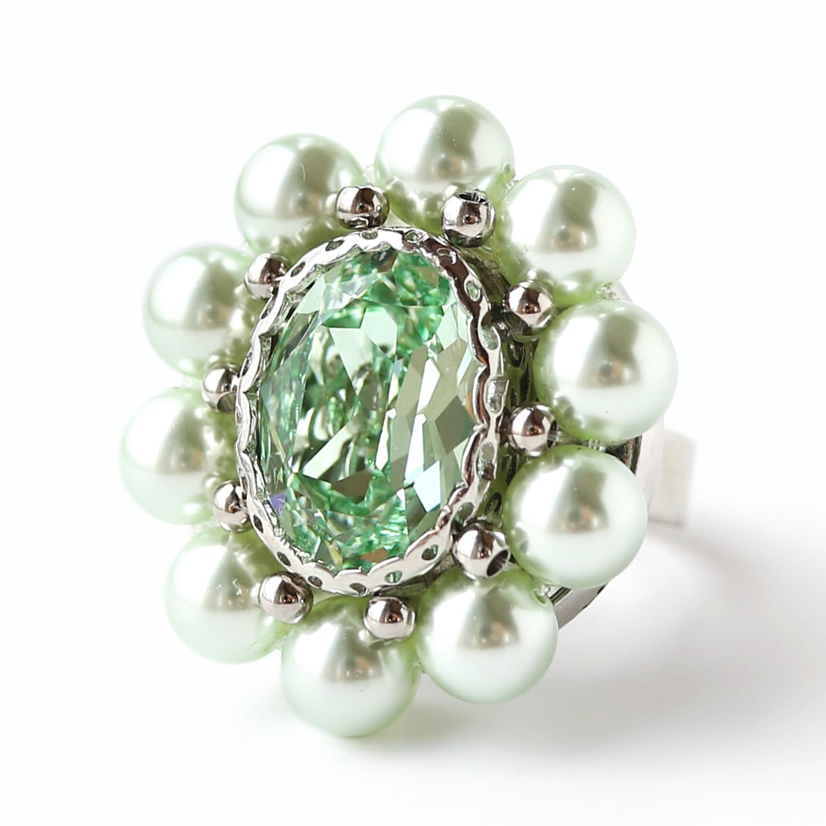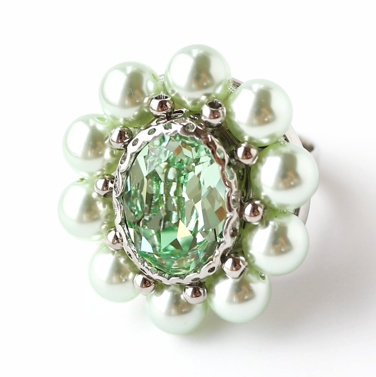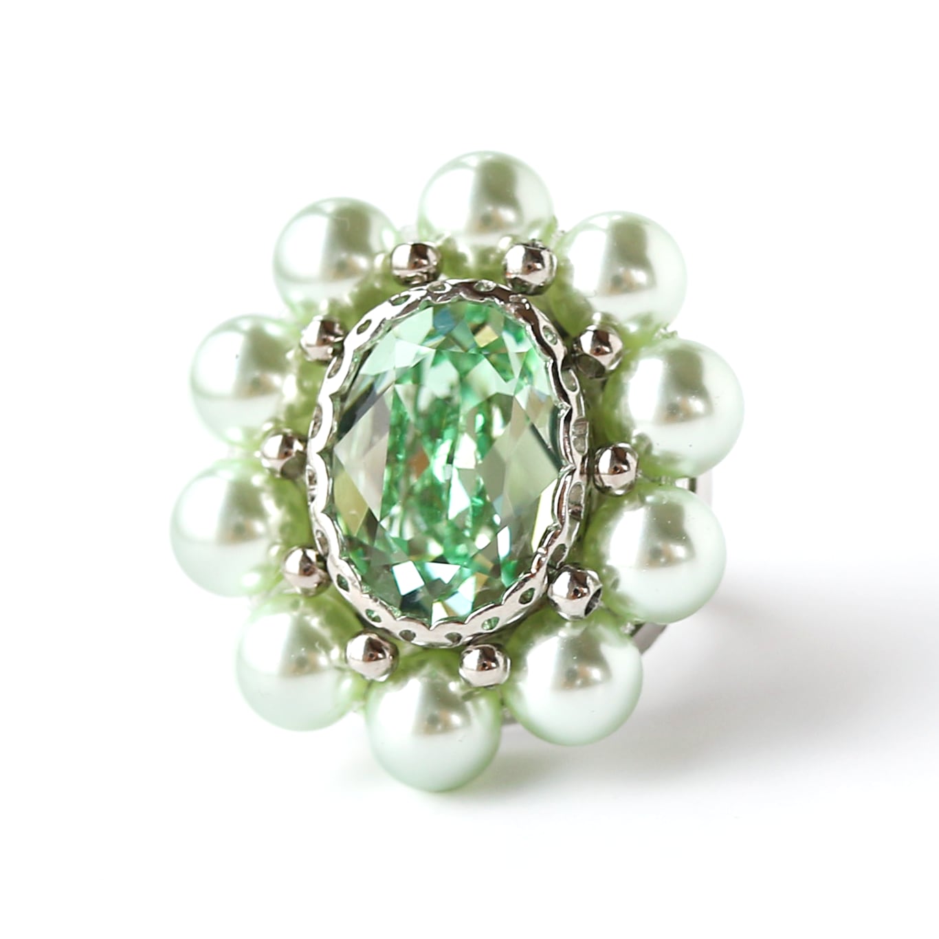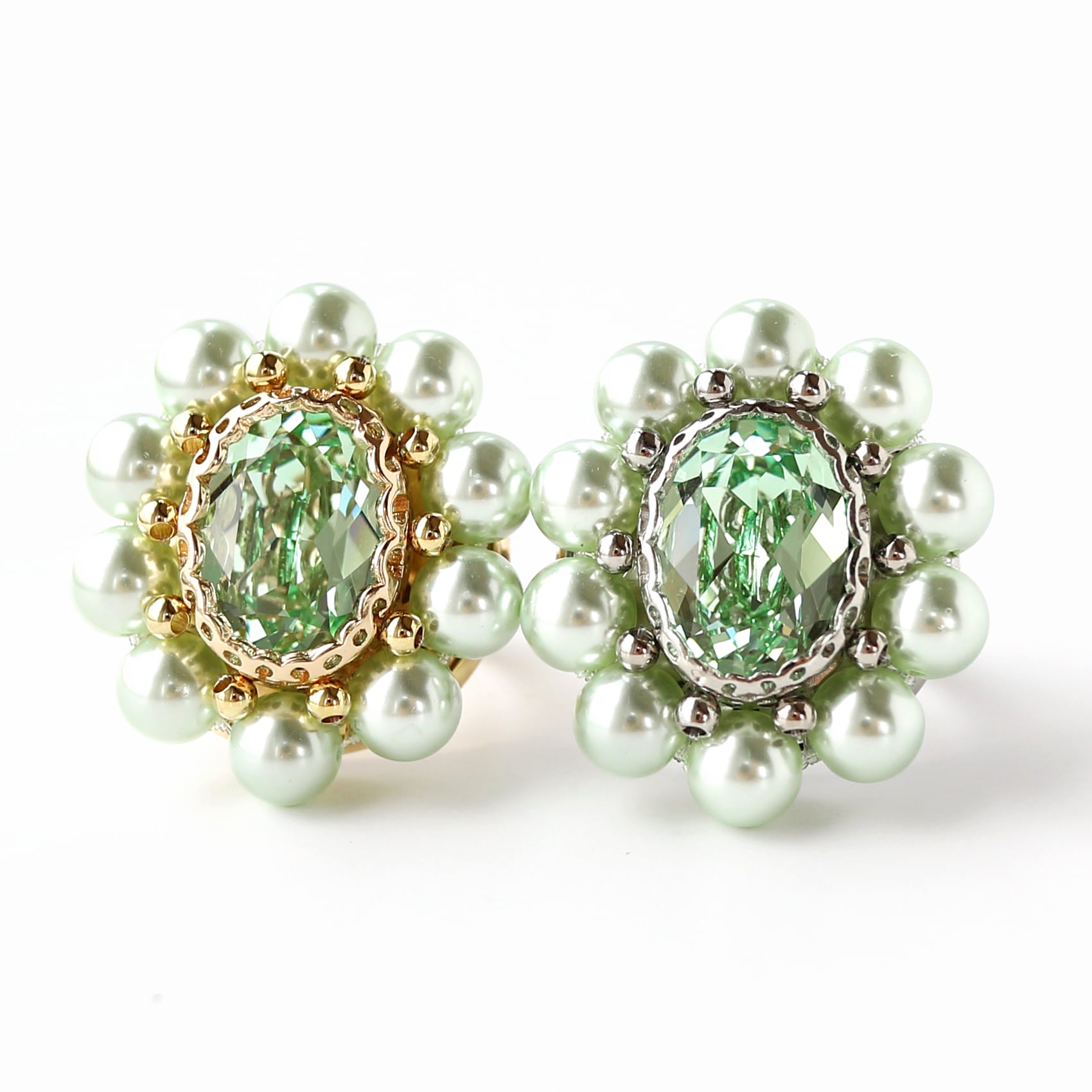 中央にクリソライトカラーのガラスビジューを縫い付け、周りにホワイトグリーンカラーの光沢が美しいガラスパールビーズを一つ一つ手作業で縫い付けております。