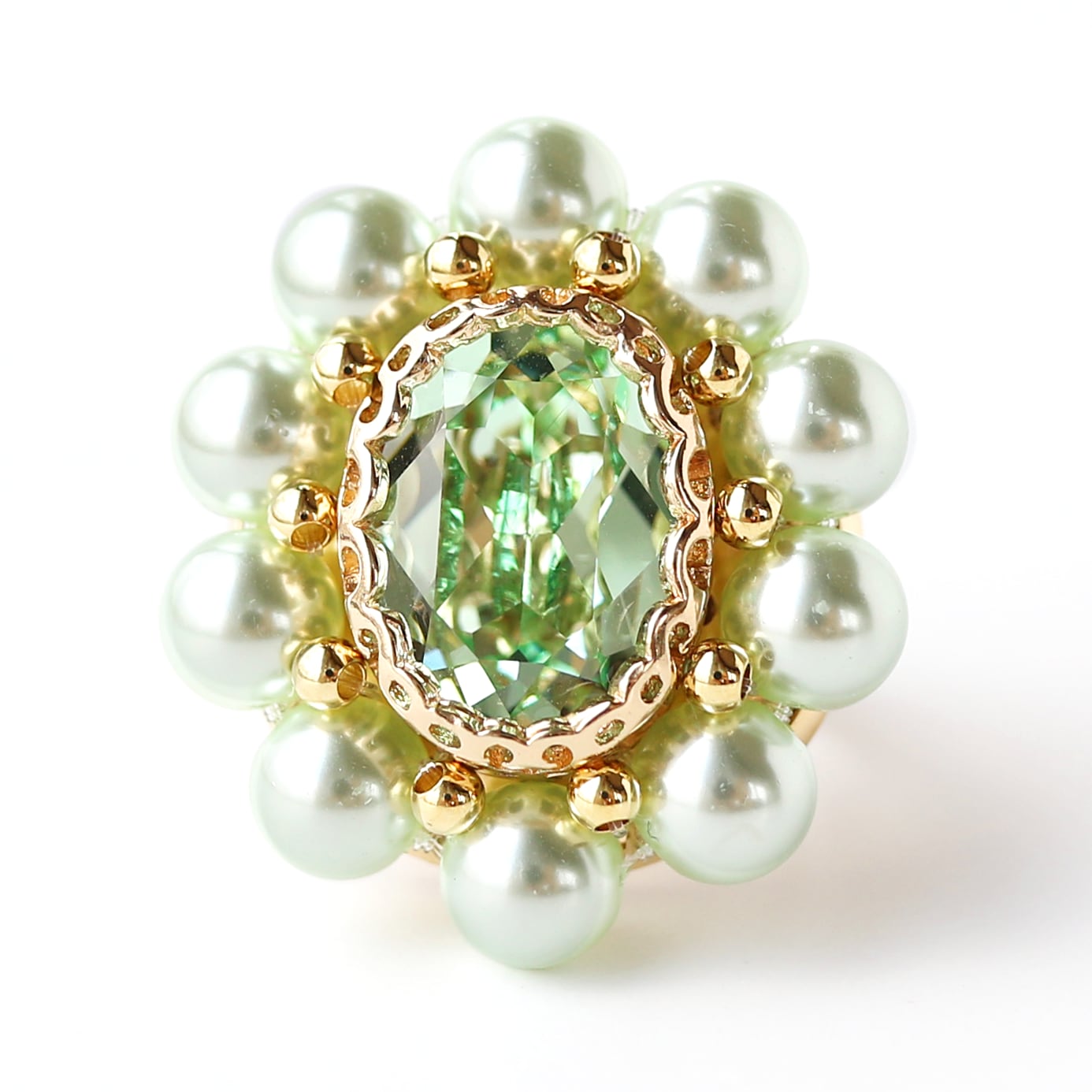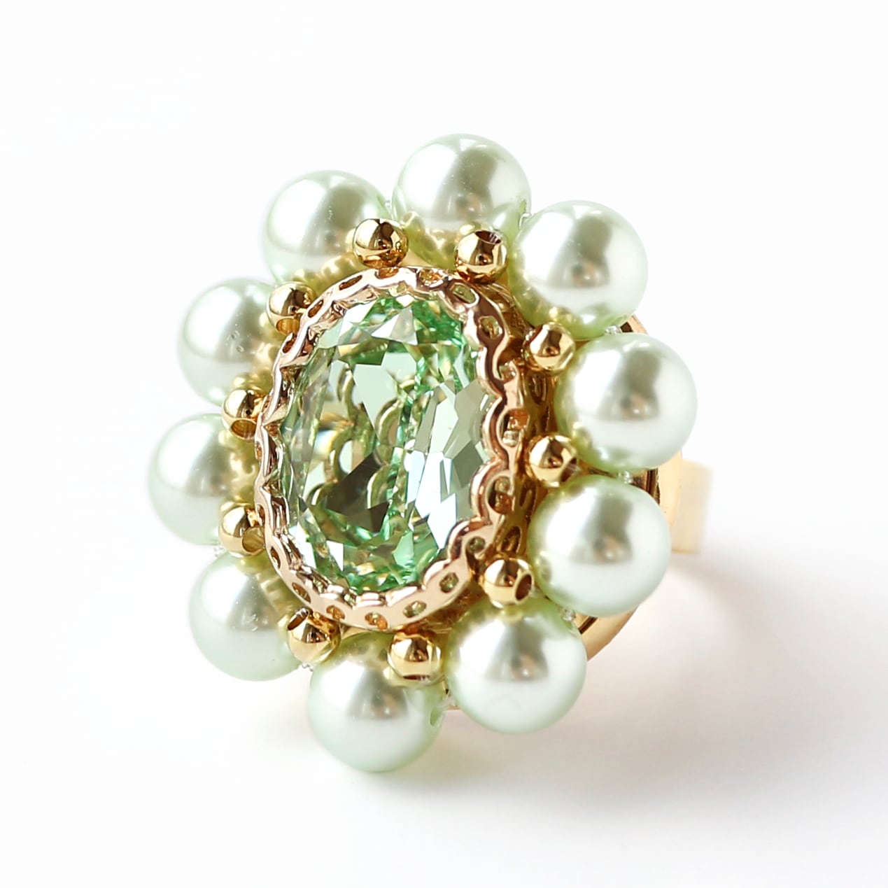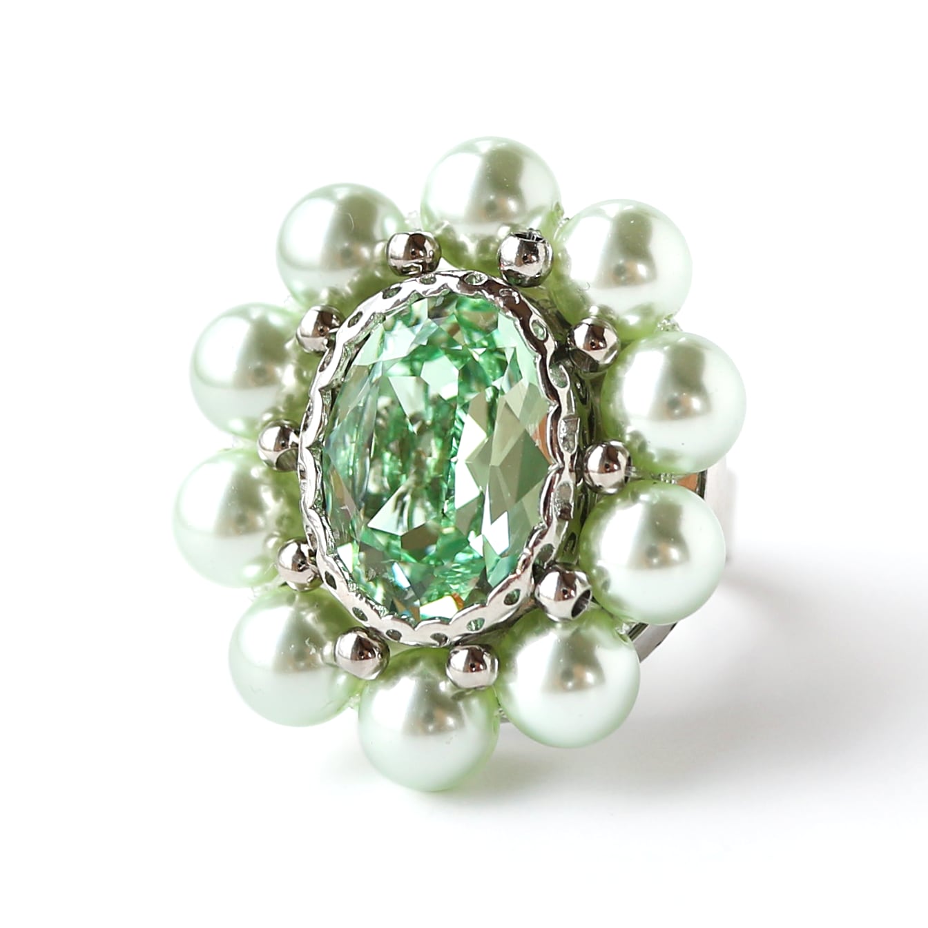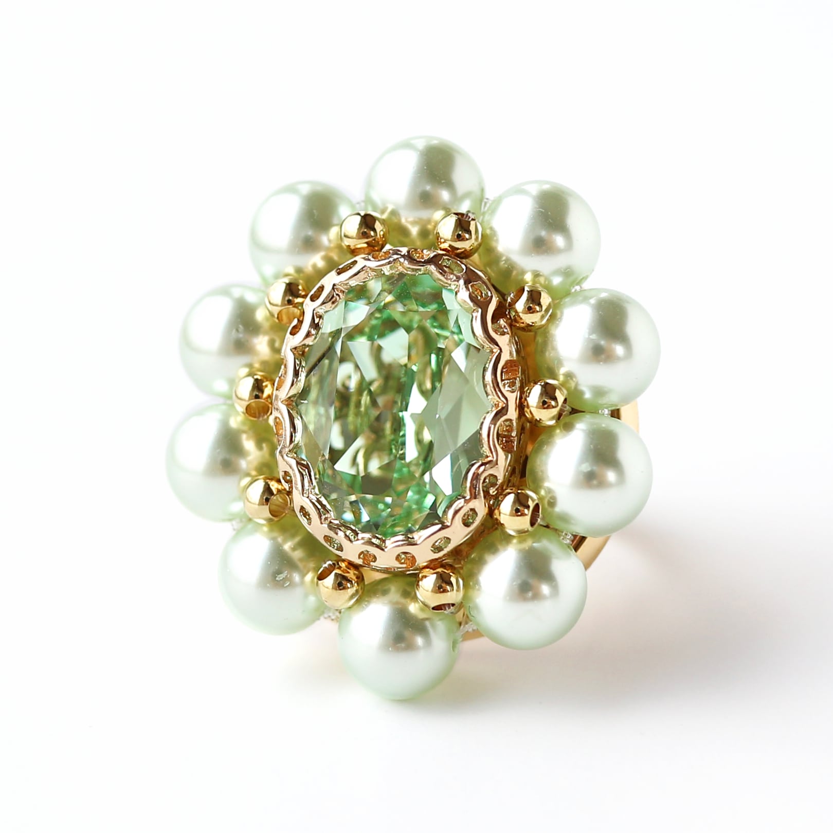 中央にクリソライトカラーのガラスビジューを縫い付け、周りにホワイトグリーンカラーの光沢が美しいガラスパールビーズを一つ一つ手作業で縫い付けております。