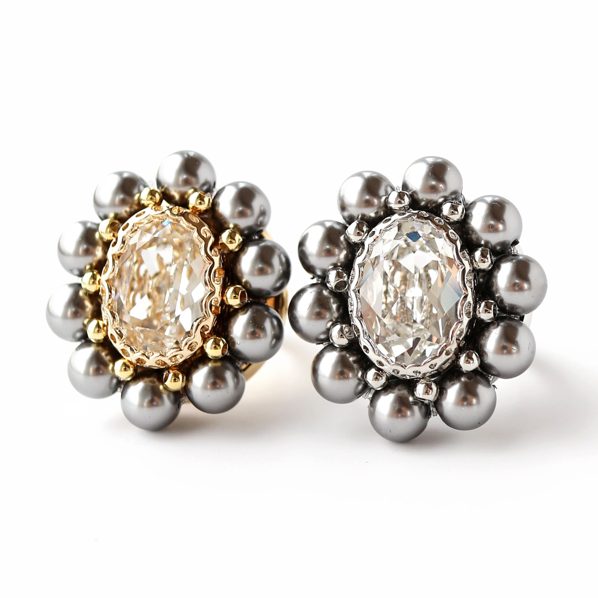 中央にクリアカラーのガラスビジューを縫い付け、周りにブラックカラーの光沢が美しいガラスパールビーズを、一つ一つ手作業で縫い付けております。
