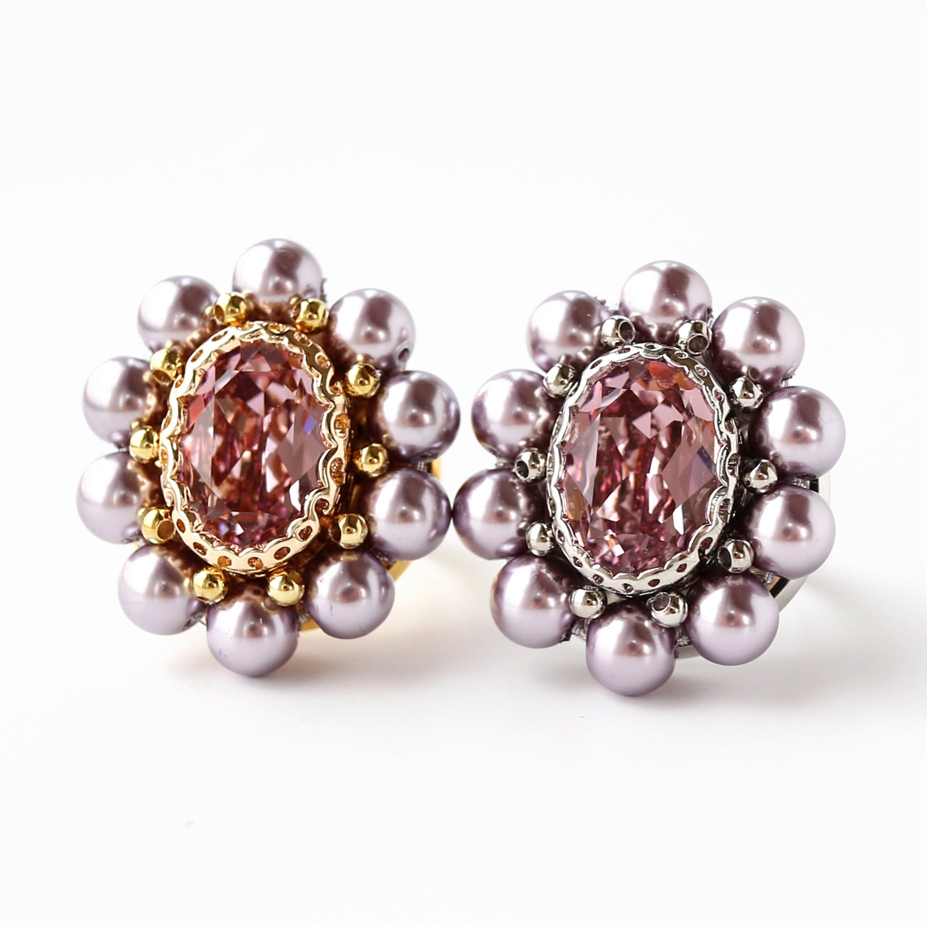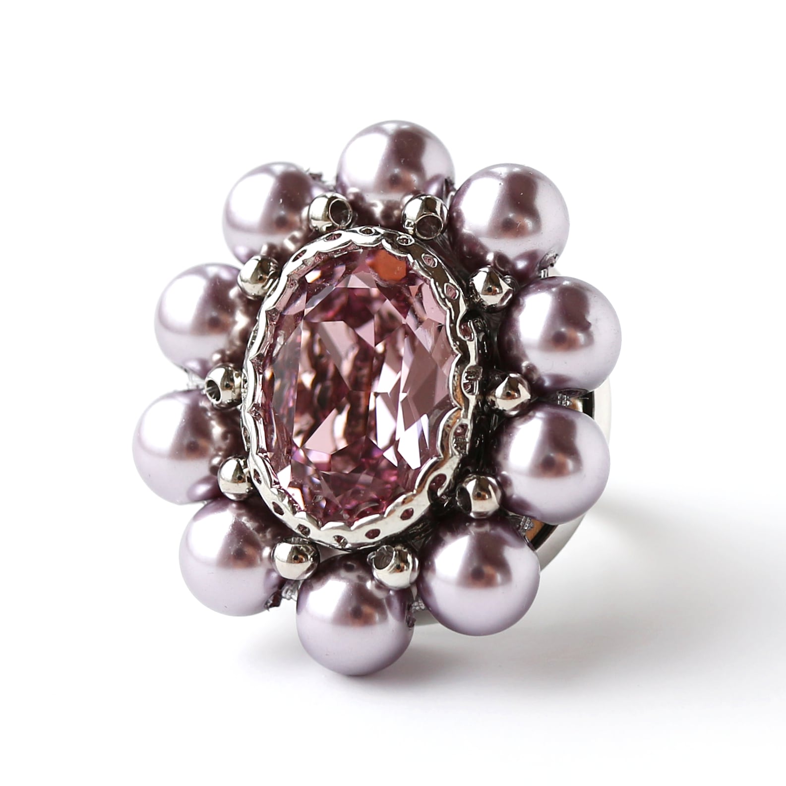 中央にパープルカラーのガラスビジューを縫い付け、周りにパープルカラーの光沢が美しいガラスパールビーズを一つ一つ手作業で縫い付けております。