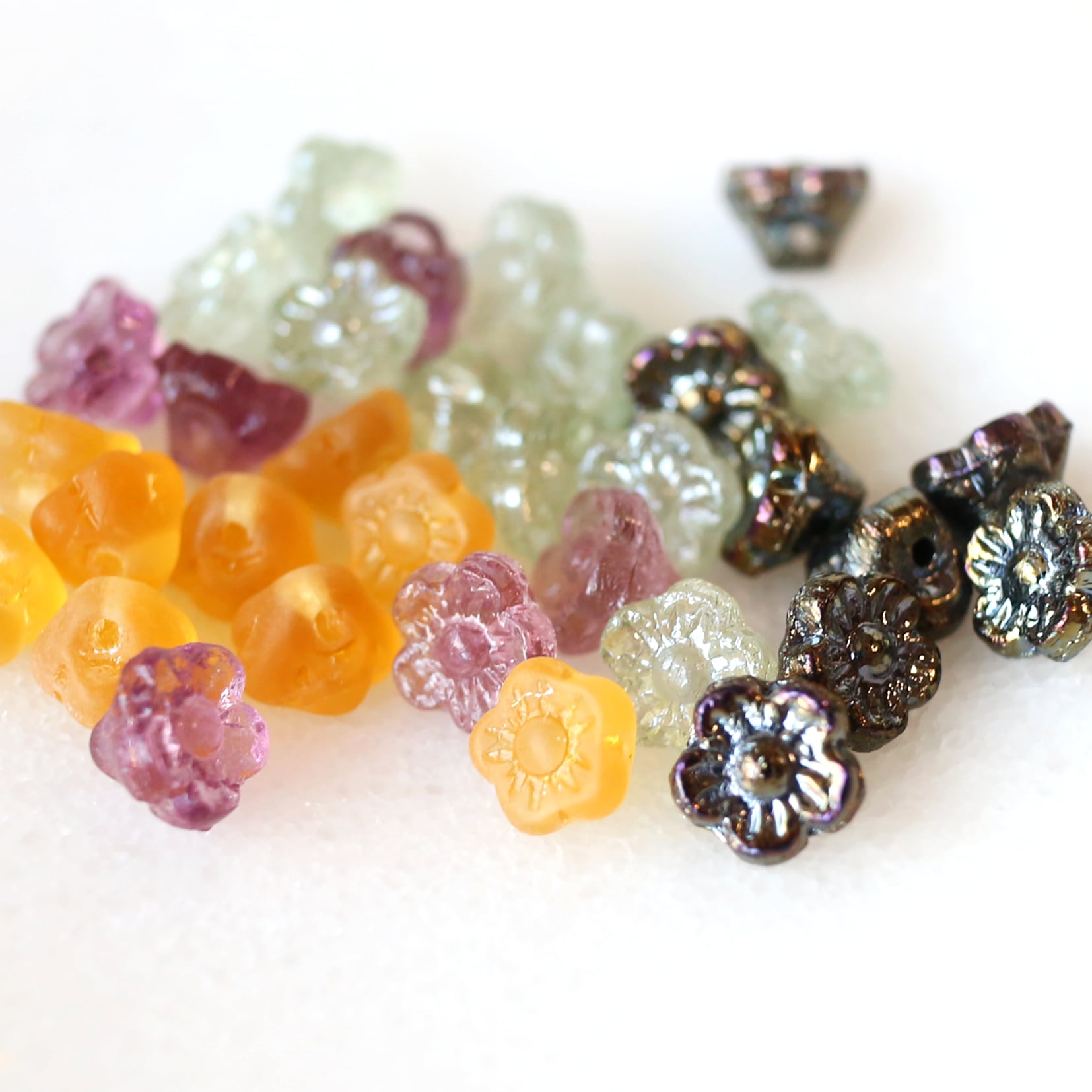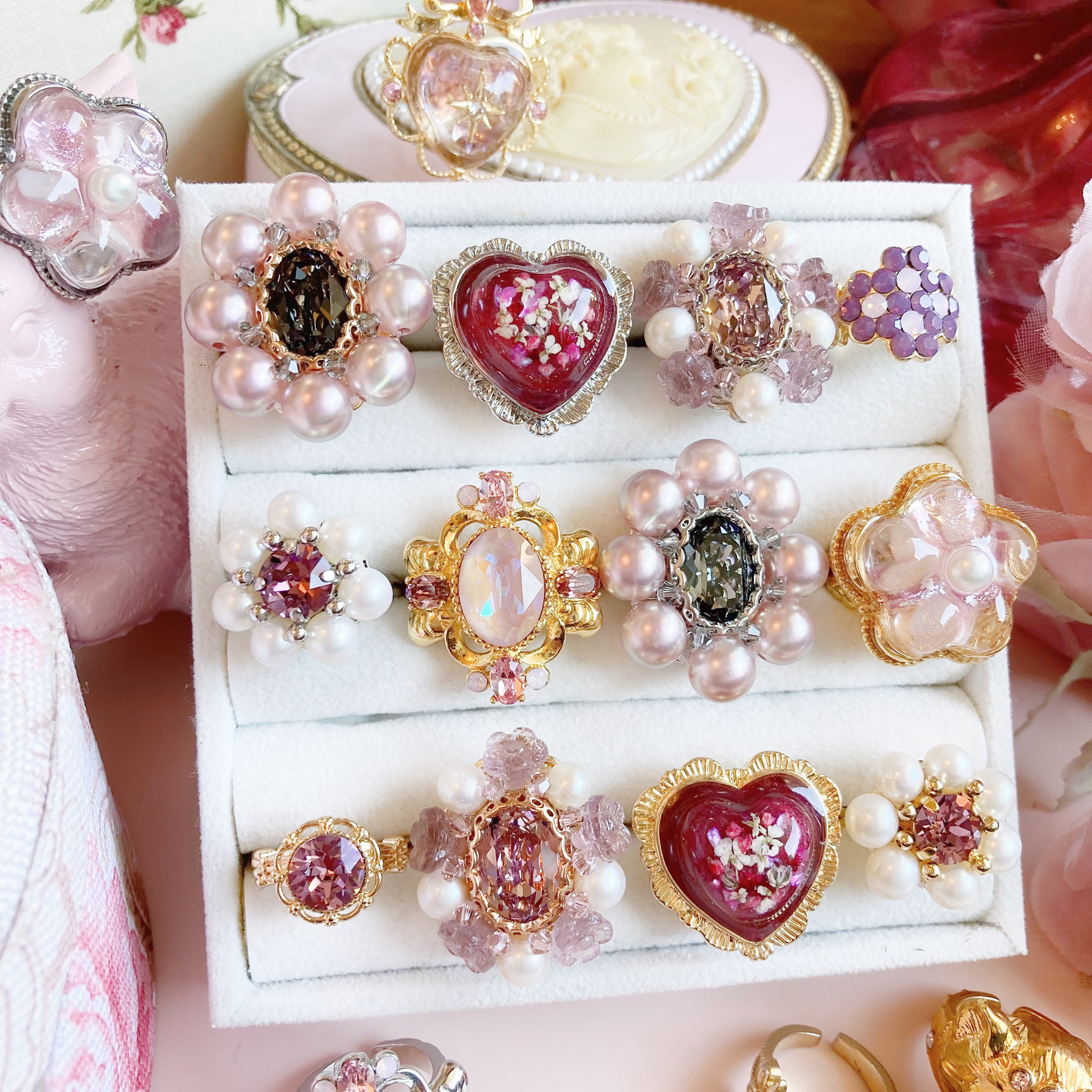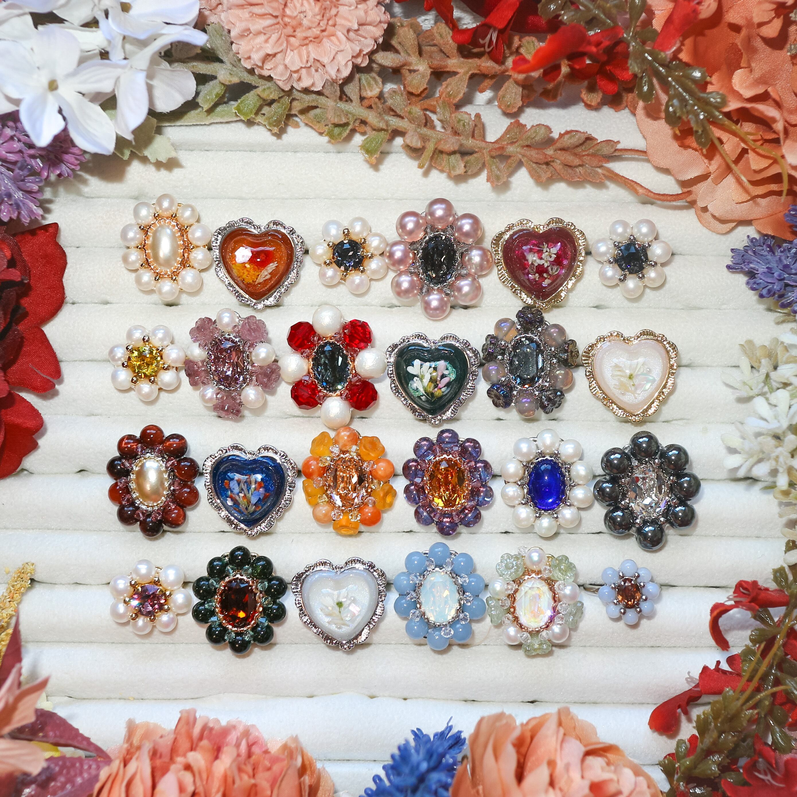 中央はクリスタルガラスビジューを、周りには、パールビーズとフラワーの形をしたチェコガラスビーズを一つ一つ手作業で縫い付けております。