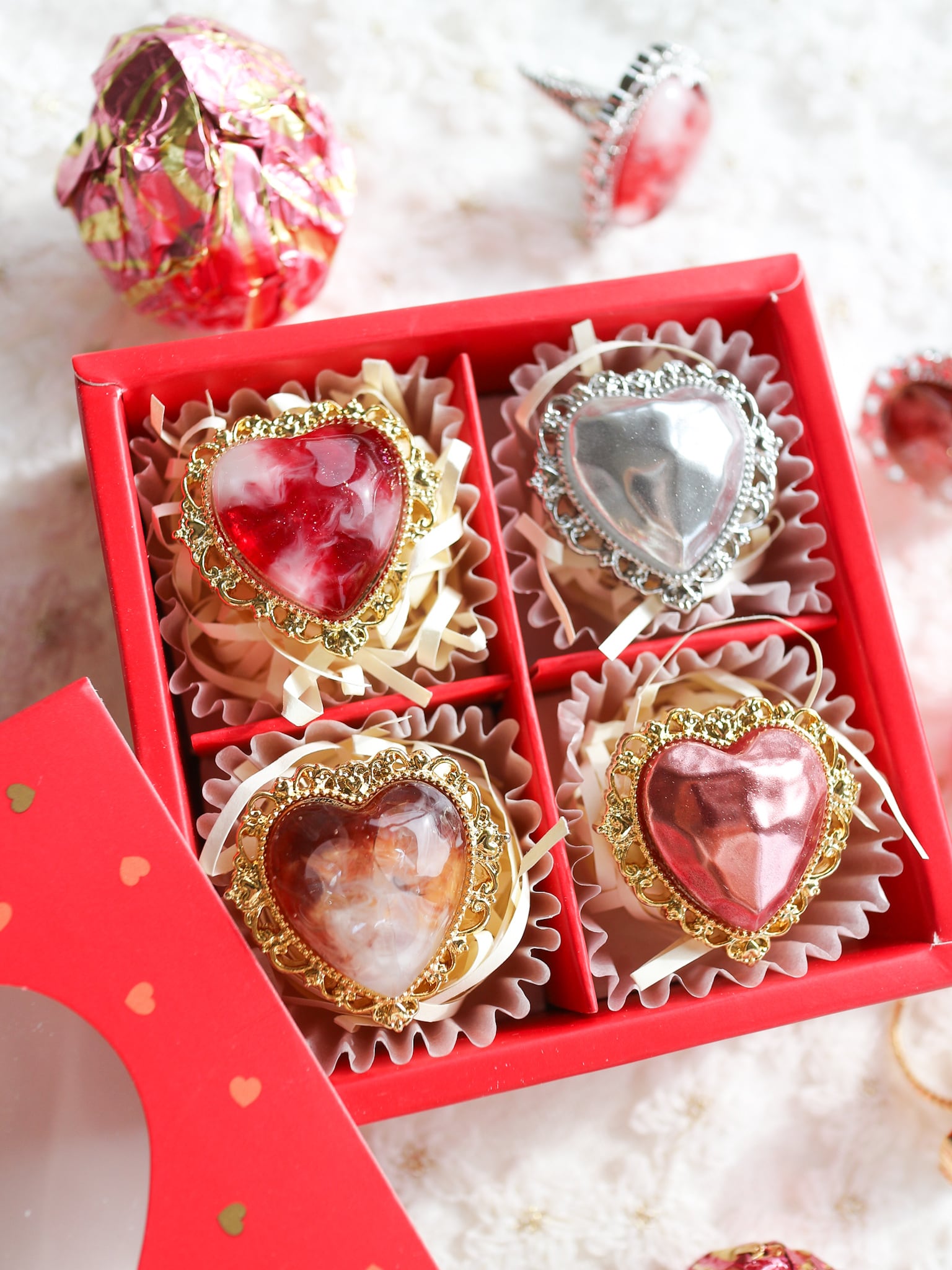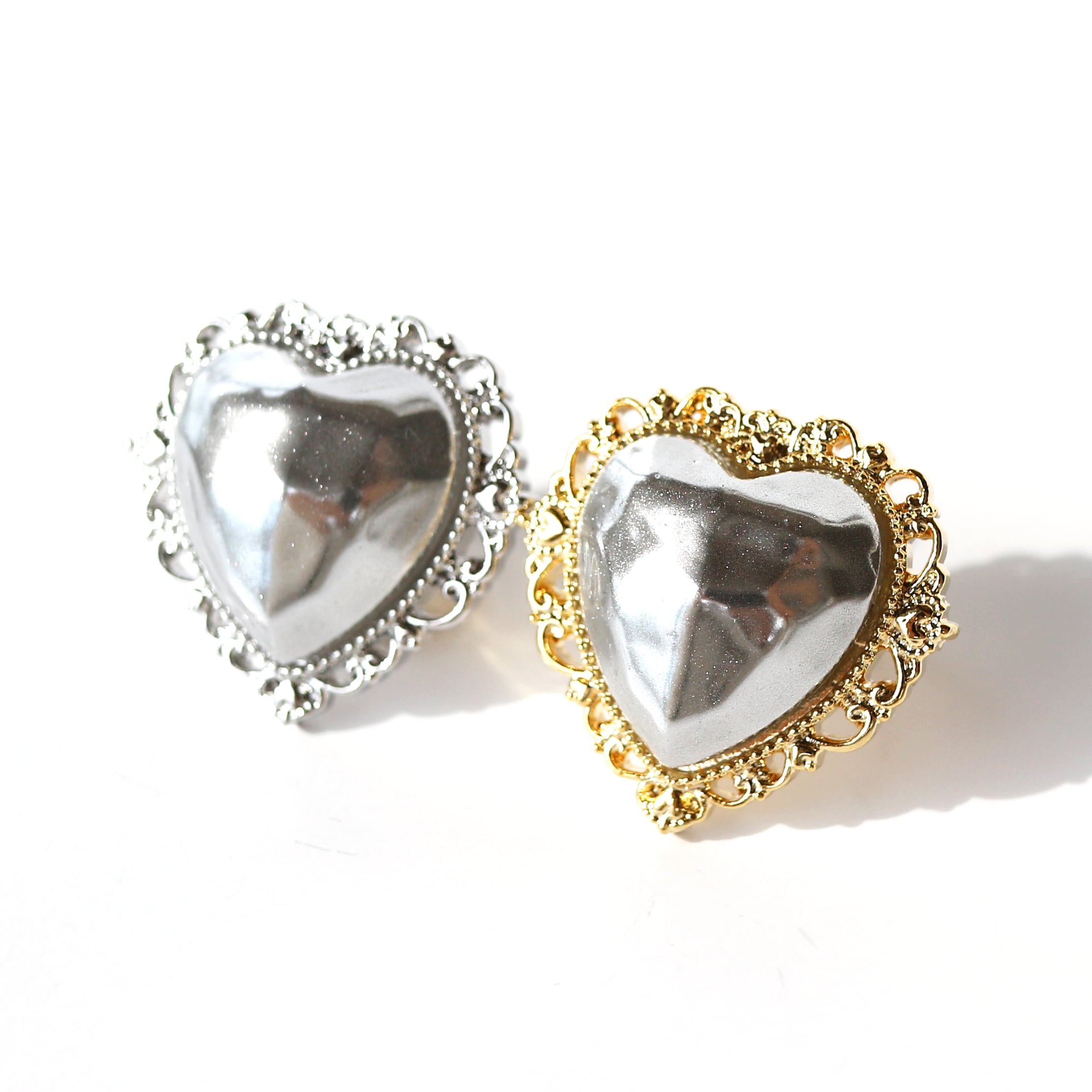 ミラーパウダーと樹脂を重ねて、メタリックなハートを作りました。