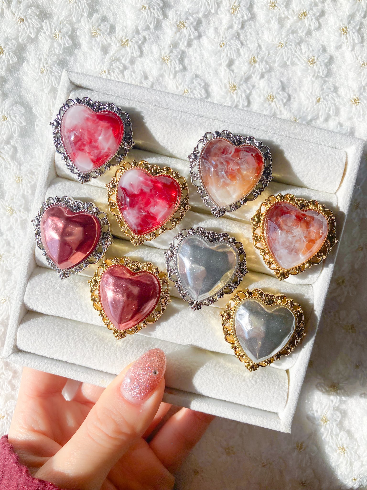 フレームには、レースと8つのハートのデザインが施されています。