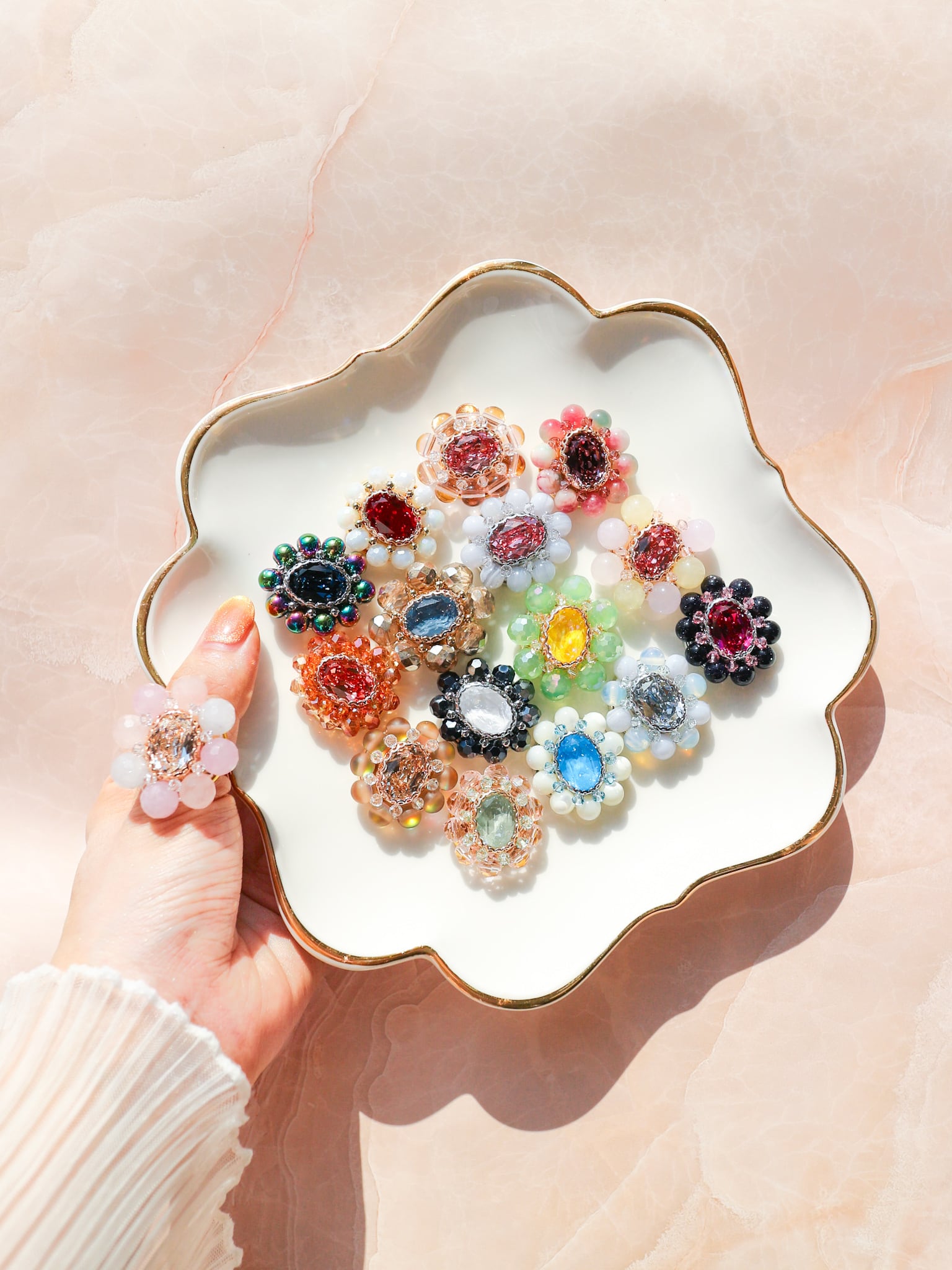 中央にクリスタルガラスビジューを縫い付け、周りにガラスとメタルビーズを一つ一つ手作業で縫い付けております。
