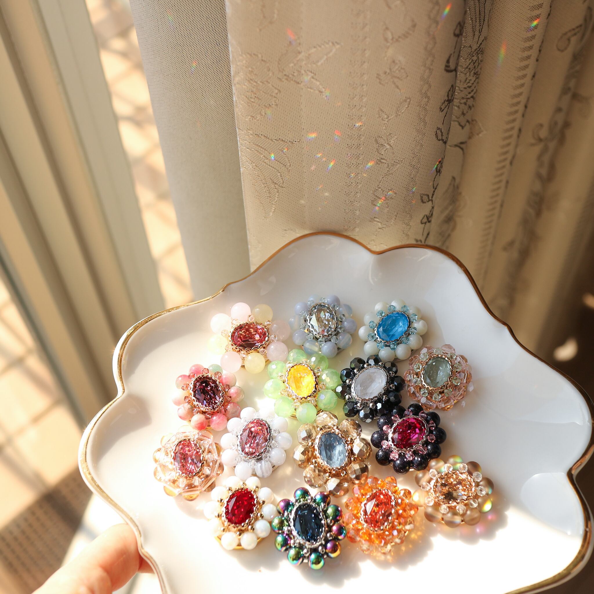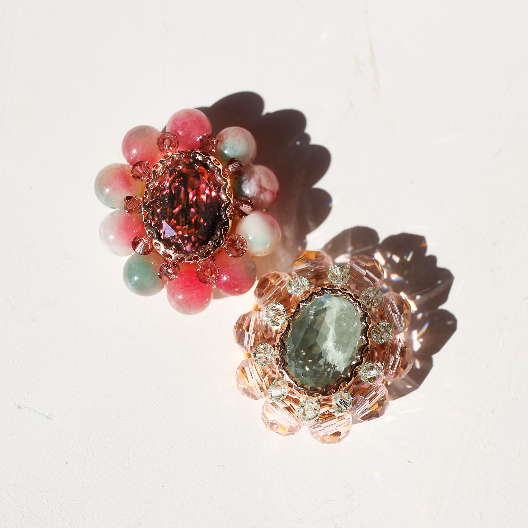 中央にクリスタルガラスビジューを縫い付け、周りにレッドとグリーンカラーのジェードビーズとガラスビーズを一つ一つ手作業で縫い付けております。